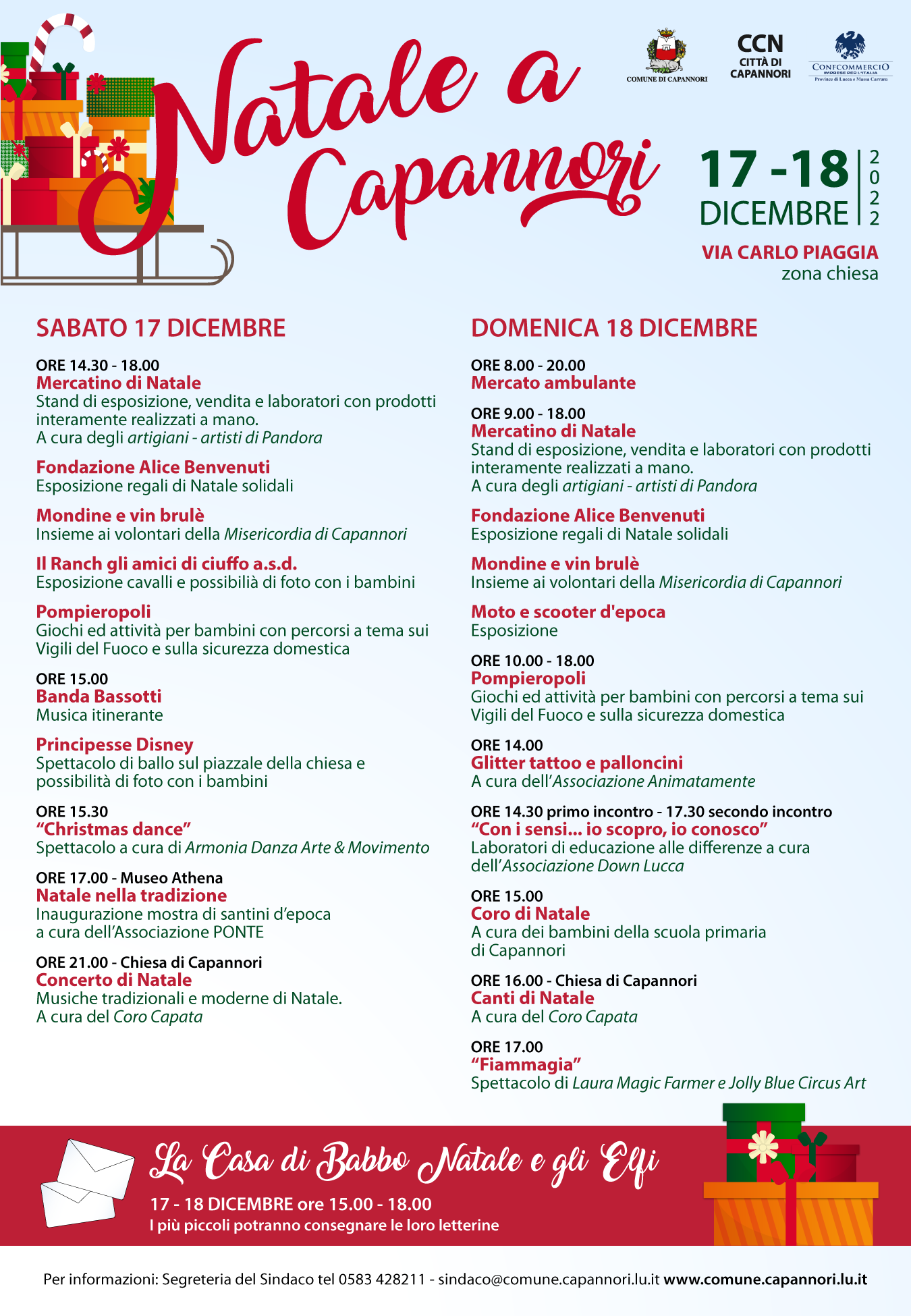 Sabato 17 dicembre: ore 14.30-18.00: ‘Mercatino di Natale’, stand di esposizione, vendita e laboratori con prodotti interamente realizzati a mano a cura degli Artigiani-Artisti di Pandora; Esposizione di regali di Natale solidali a cura della Fondazione Alice Benvenuti; Mondine e vin brulè insieme ai volontari della Misericordia di Capannori; esposizione di pony e possibilità di foto con bambini a cura de ‘Il Ranch gli amici di ciuffo a.s.d.’; Pompieropoli: giochi ed attività per bambini con percorsi a tema sui Vigili del Fuoco e sulla sicurezza domestica; ore 15.00: musica itinerante con la Banda Bassotti; Principesse Disney: spettacolo di ballo sul piazzale della chiesa e possibilità di foto con bambini; ore 15.30 ‘Christmas dance’: spettacolo a cura di Armonia Danza Arte & Movimento; ore 17.00, Museo Athena, Inaugurazione della mostra di santini d’epoca ‘Natale nella tradizione‘ a cura dell’Associazione culturale Ponte’; ore 21.00: chiesa di Capannori ‘Concerto di Natale’: musiche tradizionali e moderne di Natale, a cura del Coro Capata.