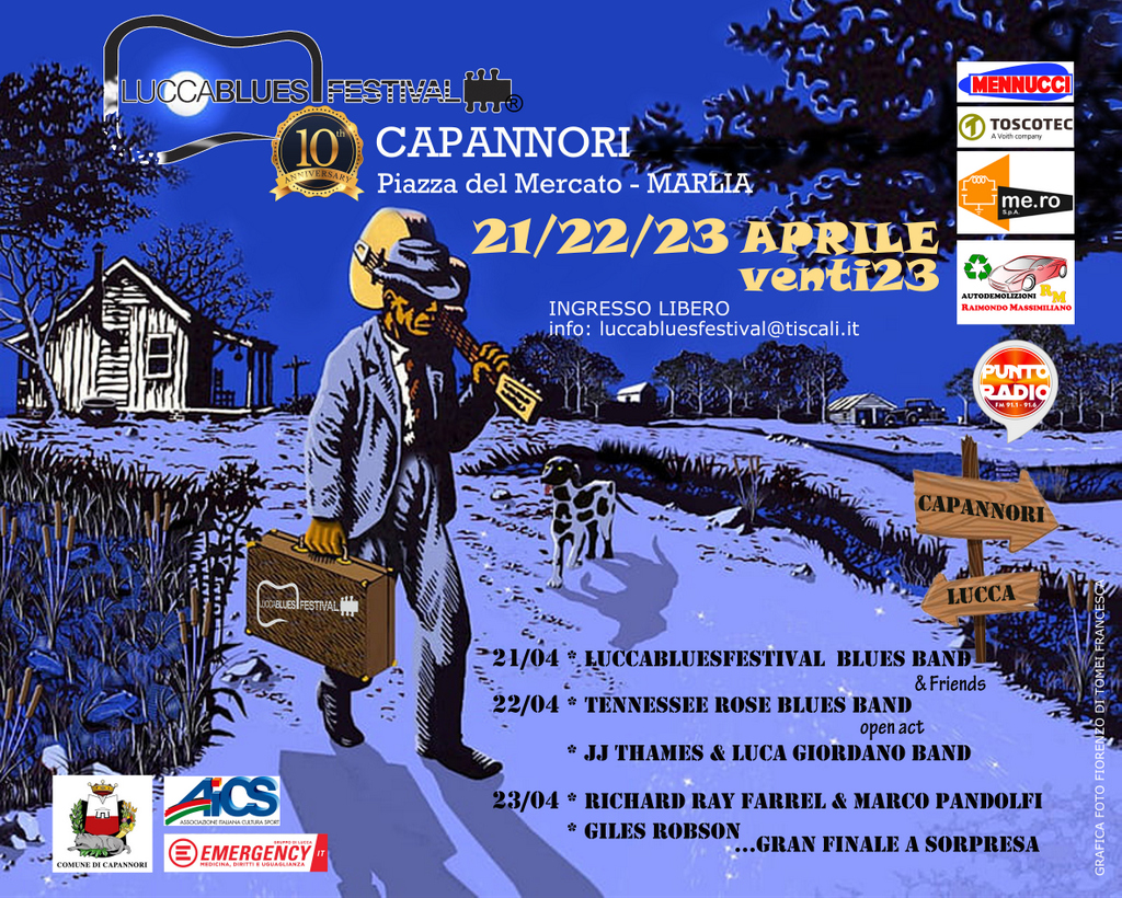 'Luccabluesfestival' festeggia i suoi dieci anni con tre serate ad ingresso libero in programma venerdì 21, sabato 22 e domenica 23 aprile nella piazza del mercato di Marlia. Un evento speciale ed atteso realizzato dall'associazione Luccabluesfestival in collaborazione con il Comune, Aics e Emergency, che vedrà esibirsi artisti internazionali ed il meglio della scena blues italiana. Tra gli ospiti, per la prima volta in Italia, Jj Thames Mississippi Blues Diva e Giles Robson, virtuoso dell'armonica blues, pluripremiato e riconosciuto a livello internazionale.