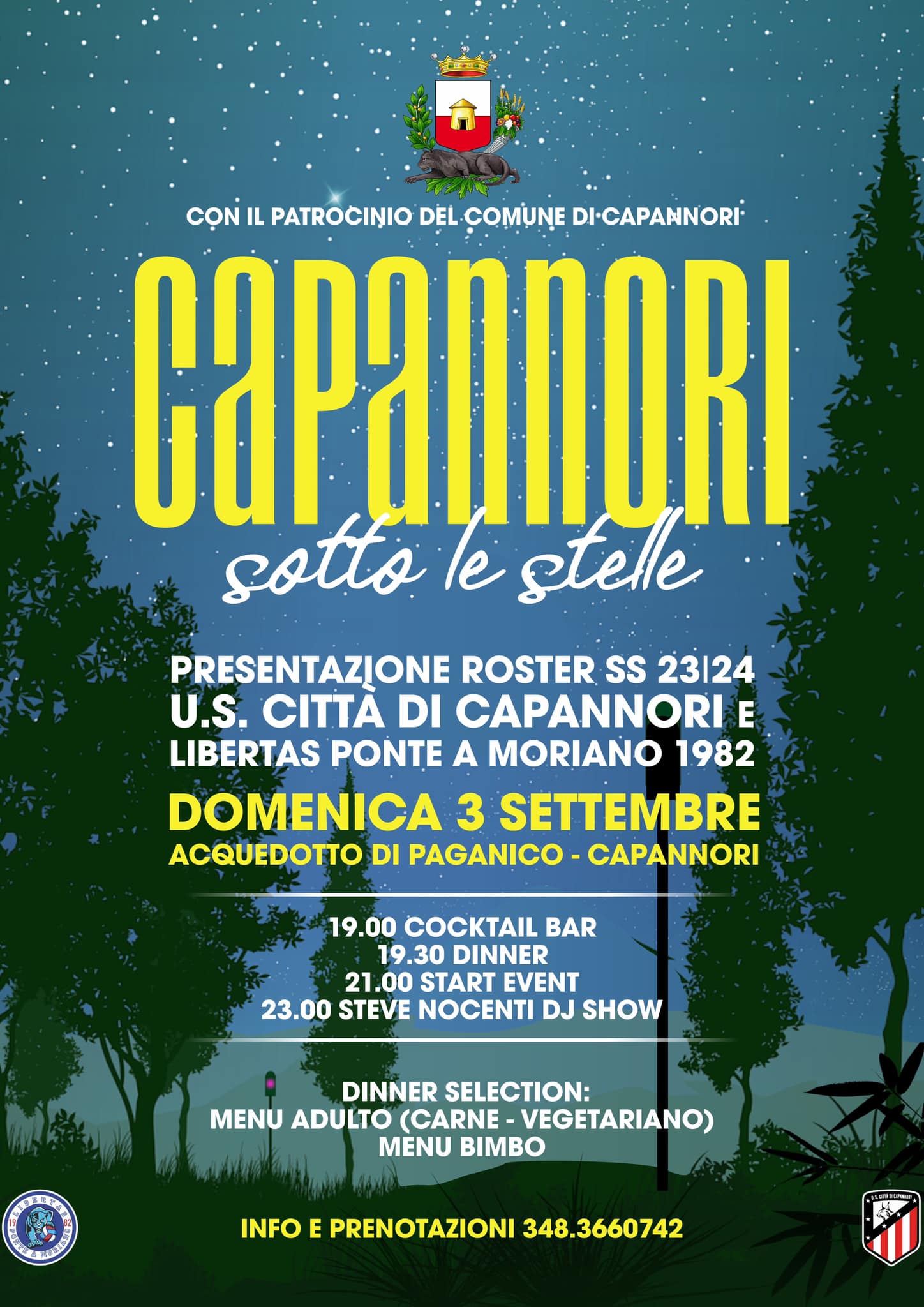 Torna la seconda edizione di "Capannori sotto le stelle". Dopo il successo dello scorso anno l'Us Città di Capannori e la Libertas Ponte a Moriano hanno deciso di ripetersi organizzando la serata evento per domenica 3 settembre nella zona sagra di Paganico.