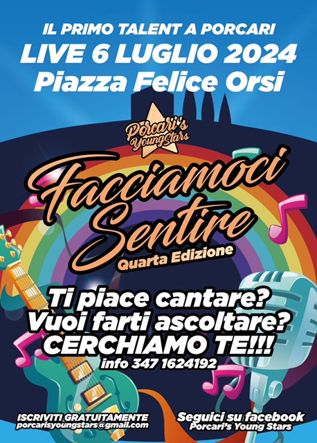 Grazie ad un gruppo di privati cittadini che hanno creato questa associazione, continua con la 4^ edizione del Concorso canoro gratuito "Facciamoci sentire" di Porcari's Young Stars APS, riservato a ragazze e ragazzi della Lucchesia fino ai 20 anni d'età che si svolgerà a Porcari in Piazza Felice Orsi il 6 luglio alle ore 21.15 all'interno delle iniziative dell'"Estate Porcarese".