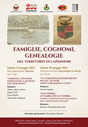 'Famiglie, cognomi, genealogie nel territorio di Capannori', questo il titolo dell'iniziativa coordinata dalla sezione Auser-Sesto dell'Istituto Storico Lucchese, in collaborazione con l'Associazione culturale Ponte, il Comune di Capannori e il Comune di Roncobello, con lo scopo di presentare e divulgare importanti studi e ricerche sulle Genealogie del territorio di Capannori. Un tema che si inserisce nel programma dei festeggiamenti dei Duecento anni del Comune di Capannori in quanto contribuisce a valorizzare il senso di appartenenza di una comunità al proprio territorio. Due gli incontri previsti, il primo si terrà sabato 13 maggio alle ore 17 alla sala parrocchiale di Matraia, il secondo sabato 20 maggio alle ore 16.30 alla sala parrocchiale di Segromigno in Monte.