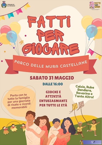 Un pomeriggio di giochi, sport e attività all'aria aperta: questo è "Fatti per Giocare", l'evento gratuito aperto alla cittadinanza, pensato per qualsiasi età, che si terrà ad Altopascio sabato 31 maggio, dalle 16, al Parco delle Mura Castellane. Un'occasione per stare insieme, dedicata al movimento, al divertimento e alla condivisione: un pomeriggio di giochi, di oggi e di una volta, socialità, aggregazione, scambio e crescita comune, dove protagonisti saranno calcetto, corsa coi sacchi, corsa a 3 gambe, roverino, pallavolo, ruba bandiera, grazie al coinvolgimento di Olympia Gym, Us Toscogas Marginone e Sport Toscana Calcio Balilla. Non mancheranno altre sorprese, il tutto a ingresso gratuito.