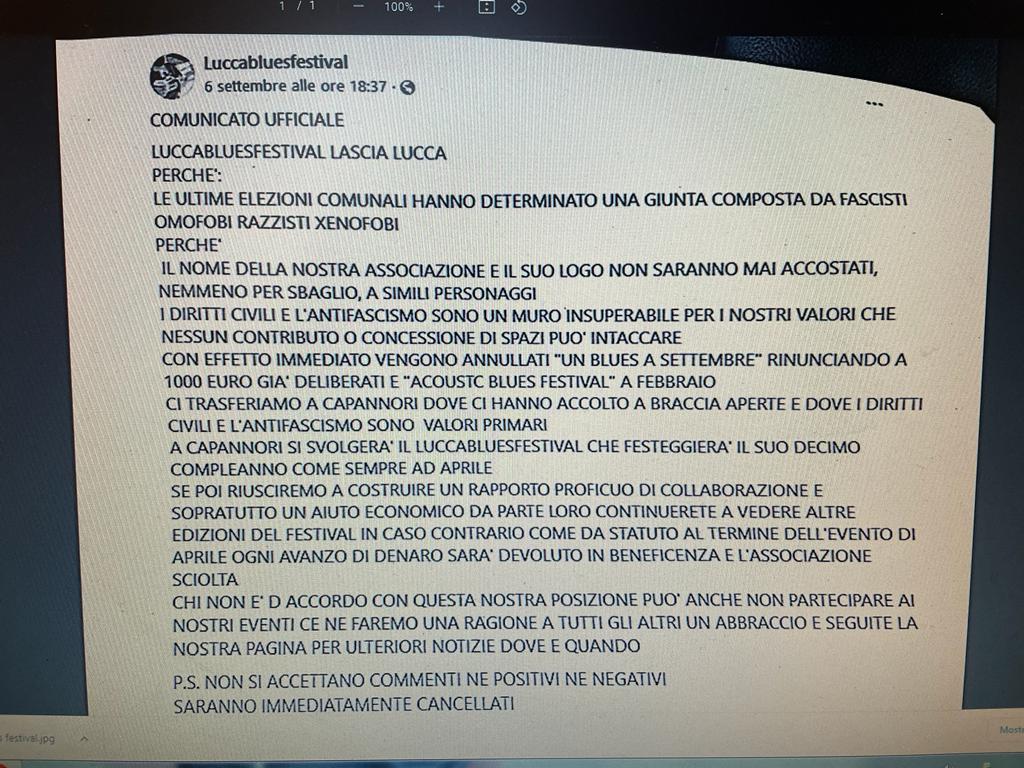 Questo lo sfogo di tutti i componenti del circolo Fratelli d'Italia di Capannori che nasce della lettura di un post uscito dalla pagina facebook di Luccabluesfestival con il quale l'associazione dichiara di voler spostare l'evento musicale a Capannori perché Lucca, sostanzialmente, è rappresentata da una "GIUNTA COMPOSTA DA FASCISTI OMOFOBI RAZZISTI XENOFOBI".