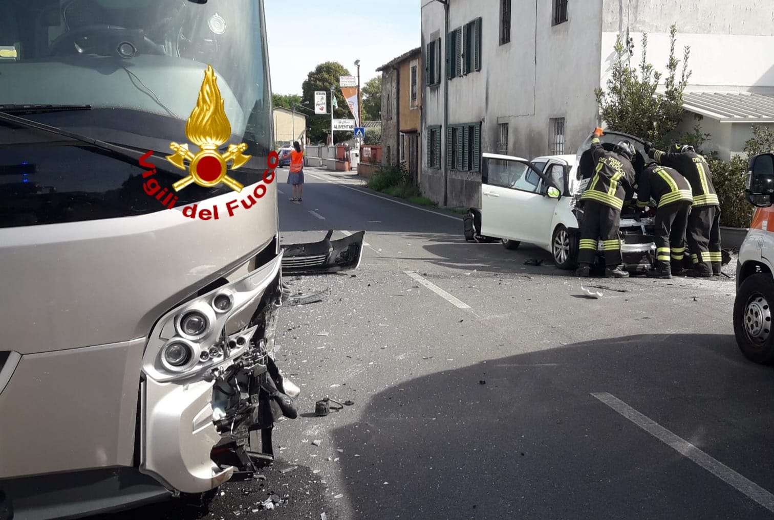 Scontro frontale tra un'auto e un pullman, di turisti svizzeri, poco dopo le 14 sulla via di Sottomonte a Guamo, vicino all'agenzia dell'entrate. Ferita la conducente dell'auto che ha riportato diversi traumi al torace e all'addome, ed è stata trasportata, in codice rosso, direttamente a Cisanello con l'ambulanza infermieristica della misericordia di Lucca.