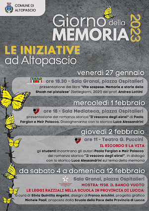Si inizia proprio venerdì 27 gennaio, alle 18.30 in Sala Granai, piazza Ospitalieri, con la presentazione del libro, organizzata insieme all'Anpi - sezione Altopascio, Montecarlo, Porcari, "Vite sospese. Memorie e storie della Shoah nel pistoiese" del professor Andrea Lottini. Il volume si basa sui diari, sulle testimonianze dirette e sulle denunce degli ebrei della provincia pistoiese, vittime di persecuzione e violenza, raccolte in queste pagine facendo riemergere storie di un passato lontano, ma incise per sempre nella memoria del territorio.