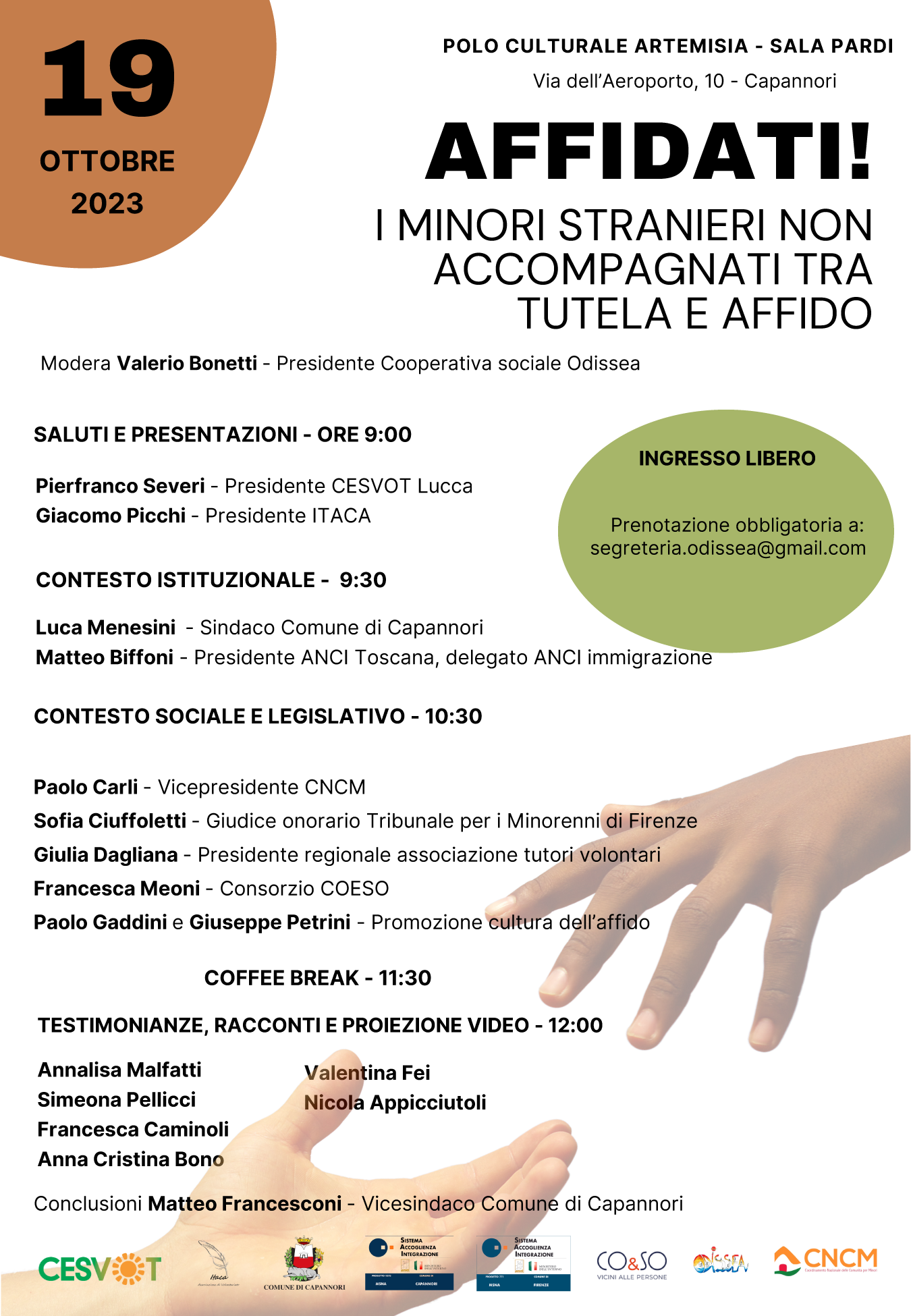 Si intitola 'Affidati!' il seminario in programma giovedì 19 ottobre, a partire dalle ore 9, al polo culturale Artèmisia di Tassignano durante il quale si parlerà dei minori stranieri non accompagnati tra tutela e affido. L'iniziativa è promossa dall'associazione Itaca con il cofinanziamento del Cesvot e vede il patrocinio del comune di Capannori e la collaborazione della Cooperativa Sociale Odissea, del Consorzio CO&SO e del CNCM (Coordinamento Nazionale delle Comunità per Minori).