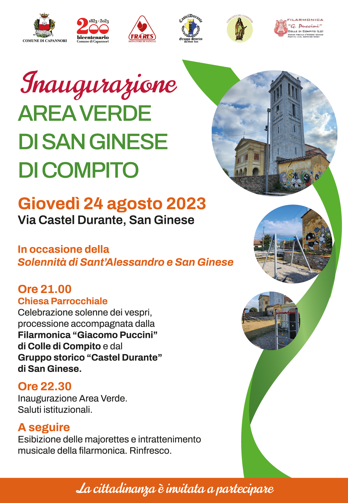 Giovedì 24 agosto sarà inaugurata l'area verde di San Ginese di Compito, situata nei pressi della chiesa che è stata riqualificata dalla Parrocchia di Sant'Alessandro e San Ginese con il contributo straordinario del Comune di Capannori nell'ambito del bando 2021-2022 'Spazi di aggregazione, beni comuni e luoghi di comunità". L'iniziativa, realizzata in occasione della Solennità di San Ginese, prenderà il via alle ore 21 con la celebrazione solenne dei Vespri e la processione accompagnata dalla Filarmonica 'Giacomo Puccini' di Colle di Compito e dal Gruppo storico' Castel Durante' di San Ginese. Il taglio del nastro della nuova area è previsto alle ore 22.30 alla presenza delle autorità, dei parroci e dei rappresentanti delle varie associazioni. A seguire si terrà l'esibizione delle majorettes e un intrattenimento musicale a cura della Filarmonica di Colle di Compito e un rinfresco finale. L'area, che vuole essere uno spazio di aggregazione per la comunità, è stata riqualificata con la risistemazione dell'area di ingresso, l'installazione di nuovi giochi per bambini e ragazzi, l'installazione di panchine e la creazione di nuove sedute, la risistemazione del locale ristoro.