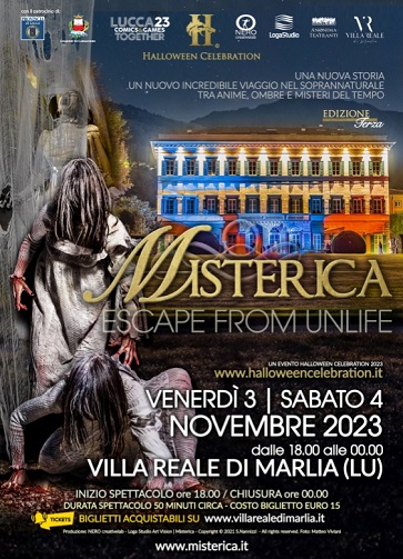 La settimana più horror di tutto l'anno targata Halloween Celebration prosegue venerdì 3 e sabato 4 novembre con Misterica (www.misterica.it), un percorso horror interattivo su doppia serata con oltre 100 attori della durata di circa 50 minuti, ambientato a Villa Reale di Marlia (LU) dove ogni anno, con una nuova storia ed un nuovo incredibile percorso che si snoderà tra i giardini, gli edifici ed il parco, viene inscenato un affascinante viaggio nel soprannaturale tra anime, ombre e misteri del tempo: "Sul cedere di ottobre, i limiti tra le dimensioni si indeboliscono, dando modo ad ombre e presenze di ritornare ai luoghi del loro passato. Così accade in Villa Reale, solo per due notti. Quanti servono ed operano entro il perimetro del parco, conoscono bene ogni quanto e nell'assoluta segretezza, all'insaputa dei padroni, donano un modo ai mortali di viver diretti la non vita. Vi sono anime benevole ed altre pericolose, ma questo è parte del gioco ed è il debito pegno della dovuta conoscenza. Così, come ogni addio, anche questo passare, lascia una traccia ad ognuno una frase in futuro per ogni vivo domani".