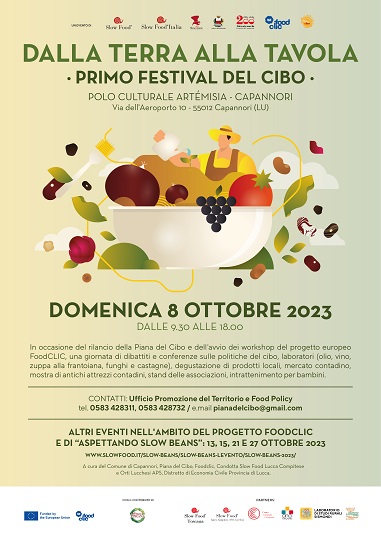 Conto alla rovescia per il '1° Festival del cibo - Dalla Terra alla Tavola' che domenica 8 ottobre, dalle ore 9.30 alle ore 18, al polo culturale Artèmisia, aprirà il programma di 'Aspettando Slow Beans', la manifestazione sui legumi e sul buon cibo locale, promossa da Slow Food Italia, Slow Food Toscana, Piana del Cibo, Comune di Capannori, Centro Culturale Compitese, Foodclic, ANCI Toscana, Condotta Slow Food Lucca Compitese e Orti Lucchesi APS, Distretto di Economia Civile Provincia di Lucca, Vetrina Toscana. Il '1° Festival del Cibo' è realizzato in occasione del rilancio della 'Piana del Cibo' con la firma del nuovo accordo di gestione partecipata delle politiche del cibo tra i Comuni di Capannori, Altopascio, Porcari e Villa Basilica e dell'avvio del progetto europeo FoodCLIC, che nella giornata di domenica attiverà i primi workshop partecipativi di visioning e pianificazione strategica. Una giornata di promozione e valorizzazione del territorio e dei suoi prodotti agricoli
