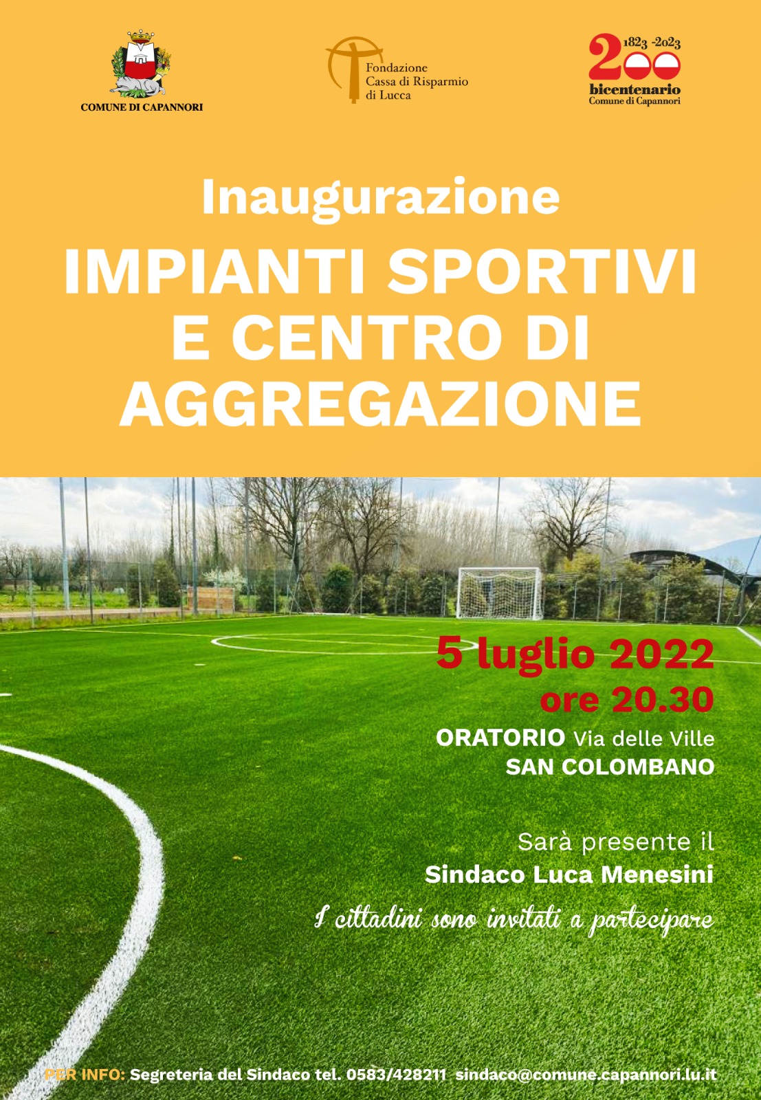 Martedì 5 luglio alle 20.30 all'oratorio di San Colombano, in via delle Ville, è in programma l'inaugurazione degli impianti sportivi e del centro di aggregazione dopo gli interventi di riqualificazione e di nuova realizzazione realizzati dalla parrocchia di San Colombano su area di sua proprietà con il contributo del comune, nell'ambito di un bando rivolto ai soggetti del “privato sociale” per la realizzazione, la riqualificazione e la valorizzazione di luoghi di comunità, spazi di aggregazione e beni comuni ed un contributo della Fondazione Cassa di Risparmio di Lucca. Al taglio del nastro interverranno il sindaco, Luca Menesini e il parroco di San Colombano Don Damiano Pacini.