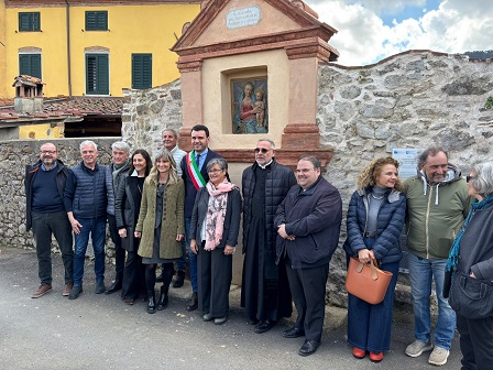 A supporto di tale ipotesi è il ritrovamento di una planimetria catastale risalente all’anno 1833, conservata presso l’Archivio di Stato di Lucca (Tav. 117, Quinto Circondario), dalla quale si evince che in corrispondenza del tratto di muro di cinta dove attualmente si trova l’edicola, esisteva un passaggio aperto, forse un cancello. Da cui si suppone che l’edicola fosse stata inserita in quel punto dopo l’anno 1833 e presumibilmente nell’anno 1863, in occasione del restauro del bassorilievo.