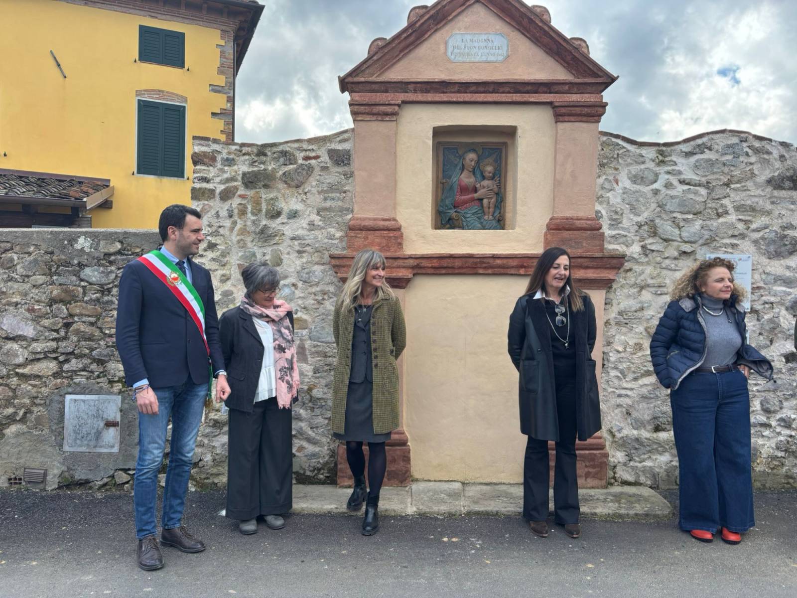 Il bassorilievo esposto all’interno dell’edicola raffigurante la Madonna del Buon Consiglio è una copia in resina dell’originale in terracotta policroma, attribuito a Matteo Civitali (Lucca 1436-1502)