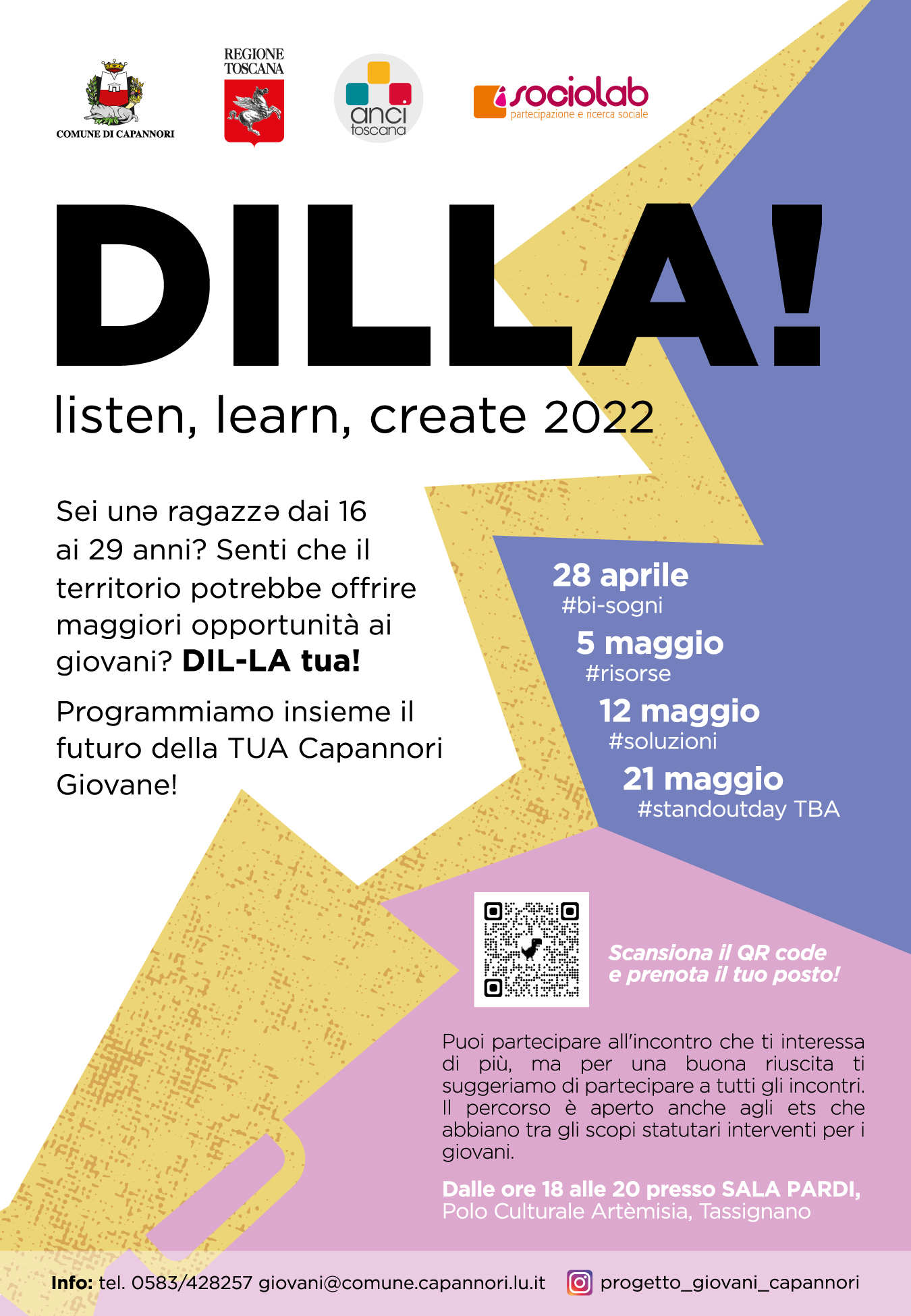 A partire da giovedì 28 aprile si svolgeranno tre incontri che vanno sotto il titolo 'Dilla! Listen, learn, create 2022' ai quali potranno partecipare giovani dai 16 ai 29 anni per proporre idee, iniziative e progetti rivolti al mondo giovanile. Gli incontri rappresentano un momento fondamentale del percorso di partecipazione 'Giovani in Co-programmazione' promosso dall'amministrazione comunale in collaborazione con Regione Toscana, Anci Toscana e Sociolab, con l'obiettivo di rendere i ragazzi e le ragazze del territorio protagonisti nella individuazione e progettazione di interventi ed azioni a favore della comunità giovanile.