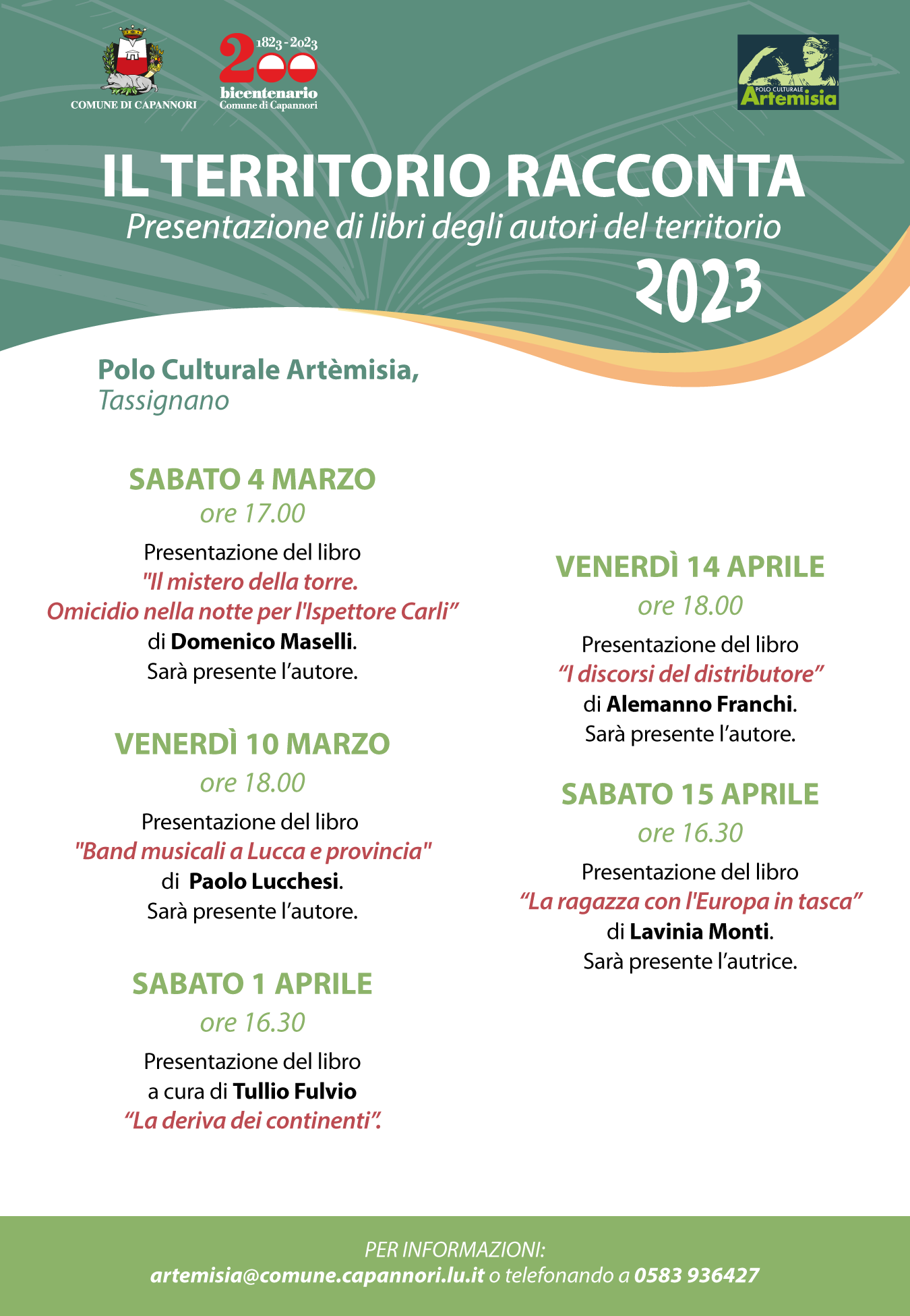Al via sabato 4 marzo un nuovo ciclo della rassegna letteraria 'Il territorio racconta' promossa dall'amministrazione comunale con l'obiettivo di valorizzare gli autori locali facendoli conoscere ad un pubblico più ampio. Cinque gli appuntamenti in programma al polo culturale Artèmisia di Tassignano fino al 15 aprile.
