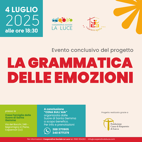 Un evento per condividere i risultati e celebrare il successo di un percorso che ha dato forma alle emozioni attraverso il gioco, il movimento e la relazione. È questo il cuore dell'incontro in programma venerdì 4 luglio alle 18,30, nella cornice della Casa Famiglia delle Suore di Santa Gemma in via dei Bocchi 248 a Segromigno in Piano, organizzato a conclusione del progetto La grammatica delle emozioni, promosso dalla Cooperativa Sociale La Luce con il contributo della Fondazione Cassa di Risparmio di Lucca.