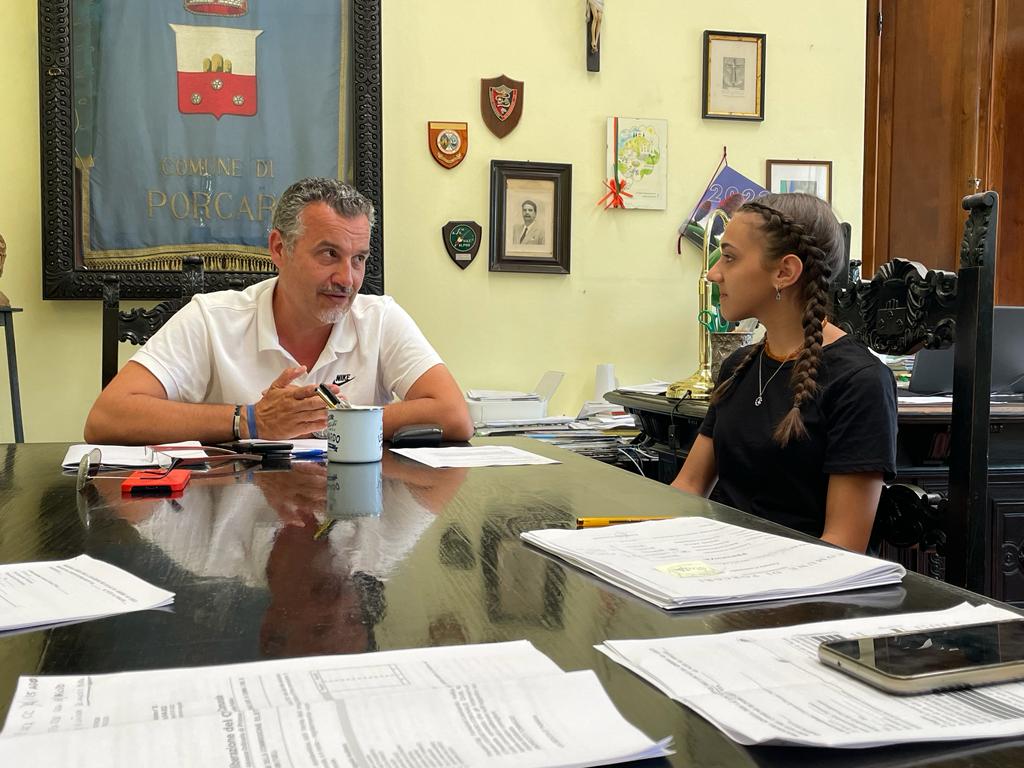 Una giornata gomito a gomito con il sindaco, per osservare da vicino come lavora un'amministrazione comunale nel quotidiano, tra incontri con i cittadini, riunioni di giunta e confronti con gli uffici. L'esperienza è stata vissuta ieri (1 agosto) dalla giovanissima Noemi Lischi, vincitrice del concorso Un logo per La Piazza rivolto alle seconde e alle terze classi della Pea dal Comune di Porcari per assegnare un'identità grafica al neo-costituito gruppo che riunisce le associazioni di volontariato del territorio. Noemi, che l'11 agosto compirà 14 anni, ha seguito con interesse tutte le attività del sindaco Leonardo Fornaciari dal mattino alle 9 fino al pomeriggio alle 17. La giornata è iniziata con un giro nei diversi uffici del Comune: segreteria, servizi sociali, ragioneria, lavori pubblici, cultura - negli spazi della biblioteca - e polizia municipale. "Mi ha colpita molto - ha raccontato la giovane Lischi - il numero di telecamere, circa 50, che sorvegliano che tutto in paese fili liscio. Ho visto la sala con i tanti monitor collegati agli occhi elettronici: tra questi, anche quello che controlla la mia vecchia scuola".