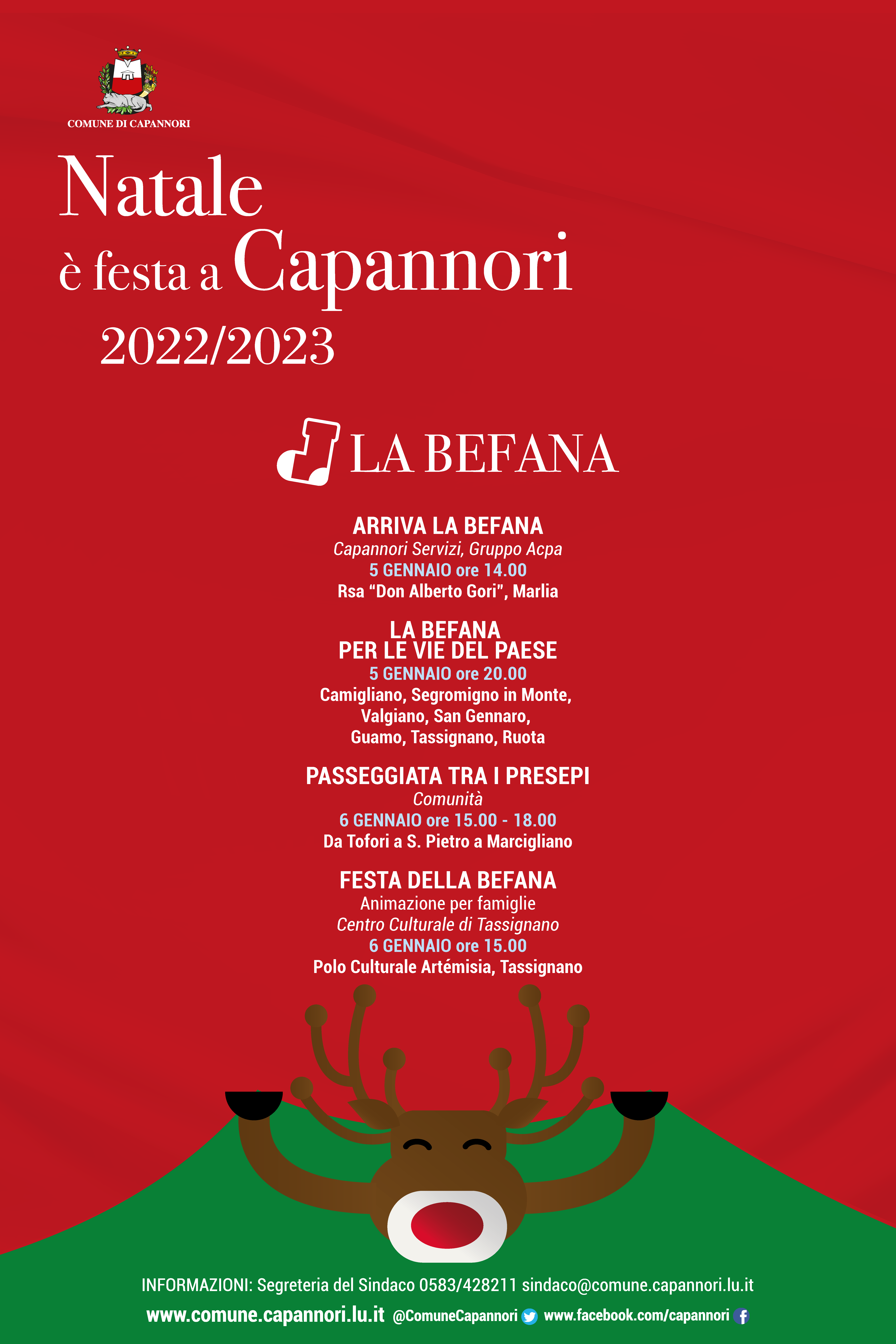 Sempre giovedì 5 gennaio alle ore 14 alla Casa di Riposo 'Don Alberto Gori', di Marlia si terrà l'iniziativa 'Arriva la Befana', organizzata dalla Capannori Servizi e dal Gruppo Acpa, mentre alle ore 18, su iniziativa del Centro Culturale di Tassignano, la Befana accompagnata da canti tradizionali partirà dal polo culturale Artèmisia per fare un giro per le vie del paese di Tassignano. Venerdì 6 gennaio, giorno dell'Epifania, alle ore 15 nella sala Pardi di Artèmisia, sempre a cura del Centro Culturale di Tassignano, si svolgerà lo spettacolo del mago Zazza . Ancora venerdì 6 gennaio dalle ore 15 alle ore 18 si terrà la Passeggiata tra i presepi da Tofori a S.Pietro a Marcigliano: a S.Andrea in Caprile alle ore 15 ci sarà lo stand gastronomico 'Le dolcezze natalizie' e alle ore 16.00 l'arrivo della Befana.