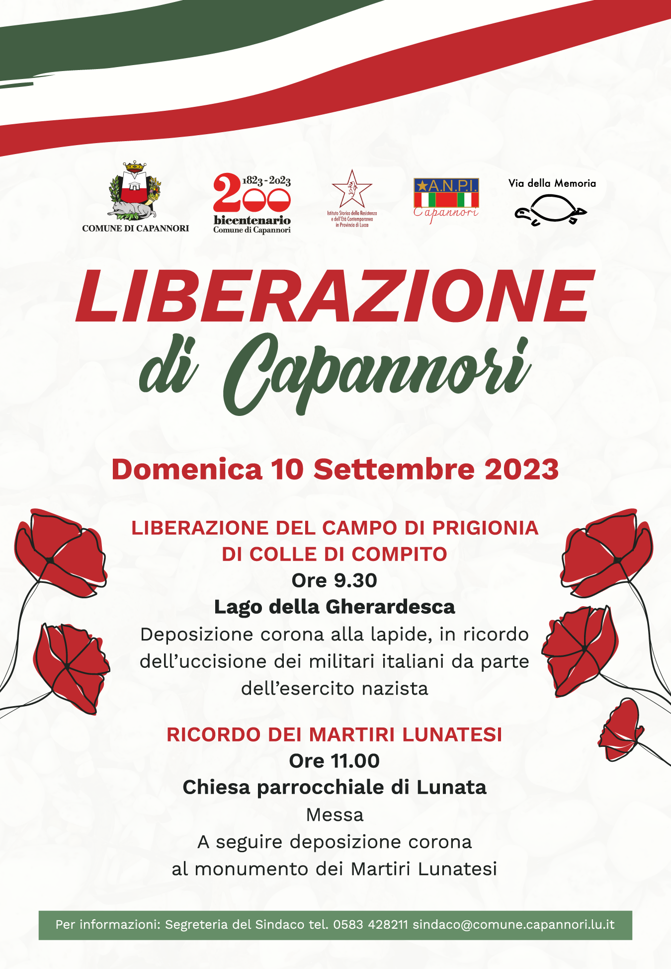 Nei giorni della Liberazione di Capannori l'amministrazione comunale, in collaborazione con l'Istituto Storico della Resistenza e dell'Età Contemporanea in Provincia di Lucca e Anpi Capannori, ha organizzato due cerimonie commemorative in programma domenica 10 settembre. La prima si terrà alle ore 9.30 al Lago della Gherardesca, dove durante la seconda guerra mondiale fu presente un campo di prigionia, con la deposizione di una corona di alloro alla lapide in ricordo dell'uccisione dei militari italiani da parte dell'esercito nazista. La seconda cerimonia in ricordo dei Martiri Lunatesi si terrà a Lunata: alle ore 11.00 alla chiesa parrocchiale sarà celebrata la Santa Messa e a seguire sarà deposta una corona d'alloro al Monumento dedicato ai Martiri Lunatesi situato sul piazzale della chiesa.