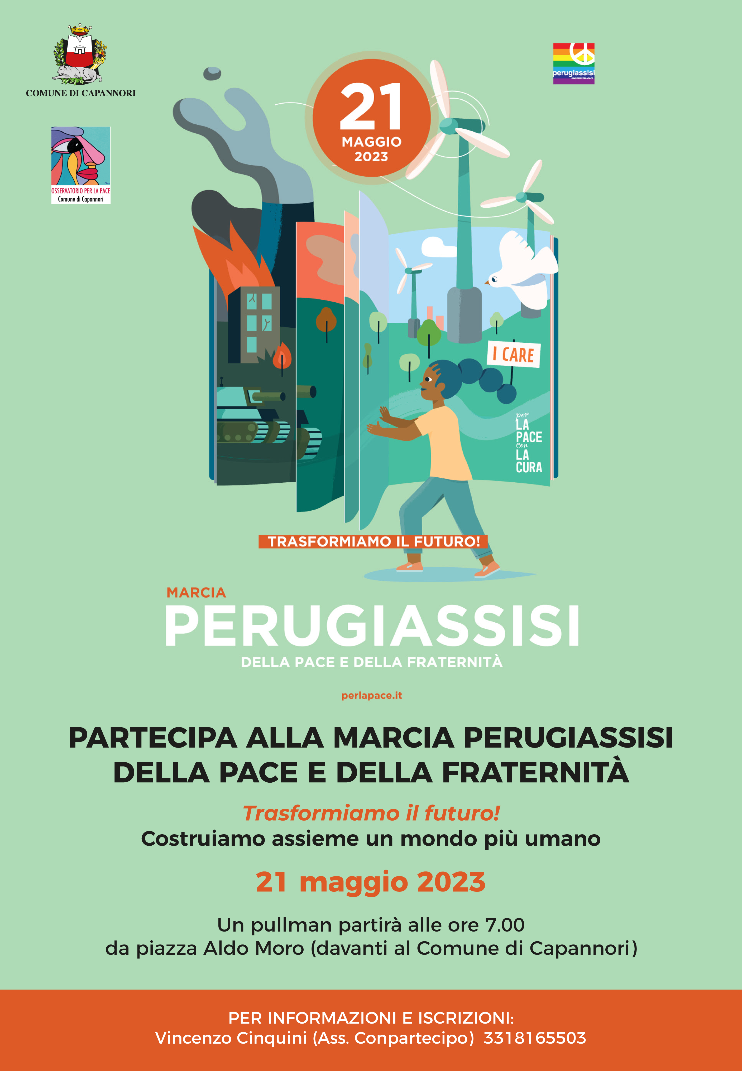 L'Osservatorio per la Pace del Comune di Capannori aderisce alla Marcia PerugiAssisi della pace e della fraternità in programma domenica 21 maggio. Prevista la partenza di un pullman da piazza Aldo Moro alle ore 7 organizzato dall'Osservatorio della Pace di Capannori e dall'Associazione Conpartecipo, anche con il contributo del Comune.