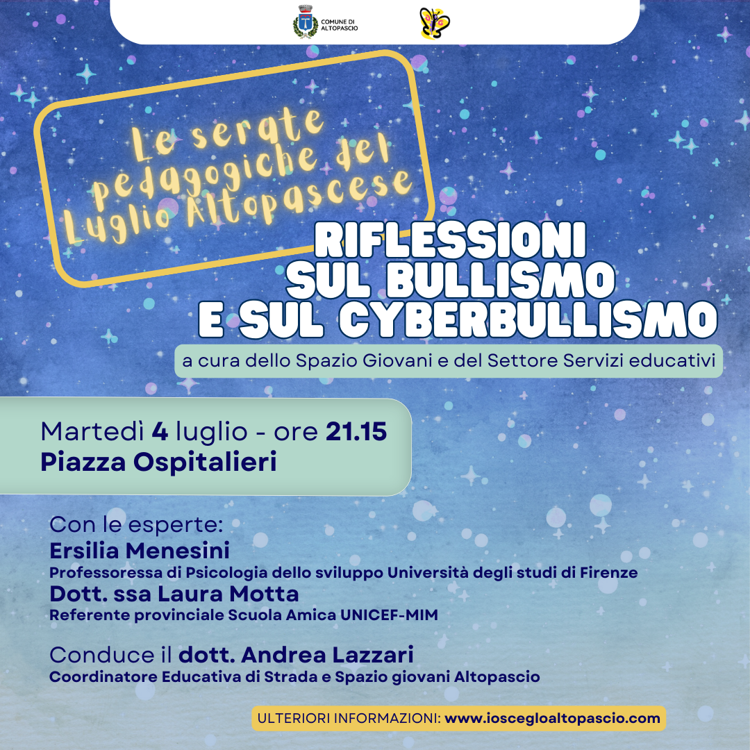 La prima serata pedagogica si terrà domani martedì 4 luglio, alle 21.15 in piazza Ospitalieri, con "Riflessioni sul bullismo e sul cyberbullismo". All'iniziativa parteciperanno le esperte Ersilia Menesini, professoressa di psicologia dello sviluppo all'Università degli studi di Firenze, e la dottoressa Laura Motta, referente provinciale Scuola Amica UNICEF-MIM. A condurre la serata sarà il dottor Andrea Lazzari, coordinatore Educativa di strada e Spazio giovani Altopascio. Al centro dell'attenzione bullismo e del cyberbullismo, due fenomeni sempre più diffusi nelle nuove generazioni.