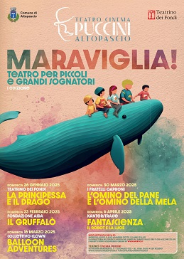 Dal 26 gennaio, al via la prima edizione di Maraviglia. teatro per piccoli e grandi sognatori al Teatro Cinema Puccini di Altopascio, una stagione organizzata dalla Compagnia Teatrino dei Fondi, in collaborazione con il Comune di Altopascio. Con la direzione artistica di Enrico Falaschi la stagione prevede spettacoli per bambine e bambine con 5 appuntamenti in domenicale.