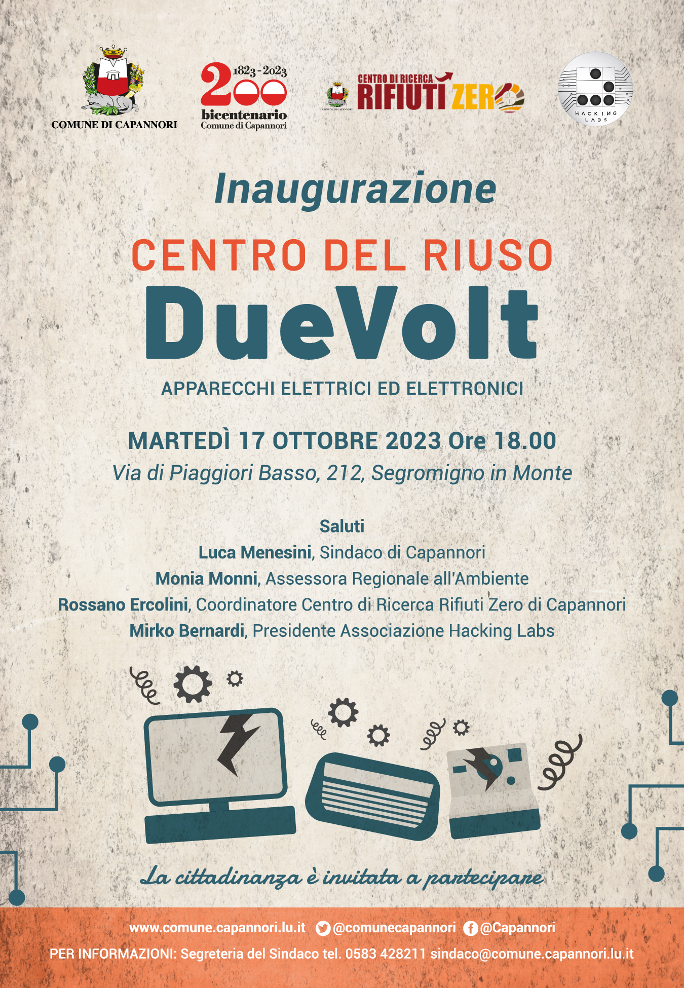 Sarà inaugurato martedì 17 ottobre, alle ore 18, il nuovo centro del riuso di apparecchiature elettriche ed elettroniche 'DueVolt' gestito dall'associazione Hacking Labs a seguito di un bando di assegnazione emesso dal comune.