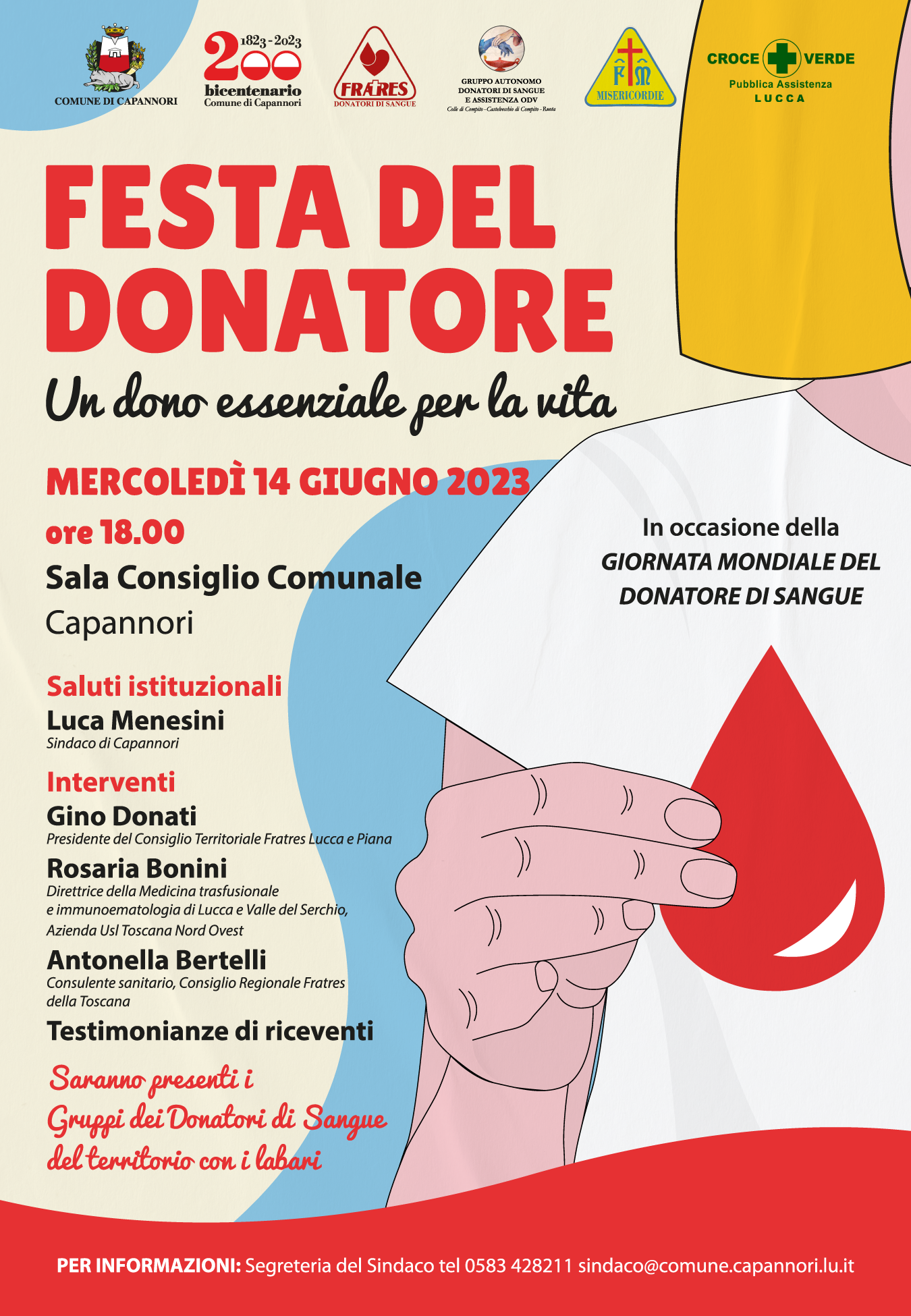 In occasione della ‘Giornata Mondiale del Donatore di sangue’, mercoledì 14 giugno alle ore 18 nella sala del consiglio comunale si terrà la ‘Festa del donatore’- Un dono essenziale per la vita- promossa dall’amministrazione comunale. Un’iniziativa realizzata nell’ambito degli eventi del Bicentenario del Comune che sarà moderata dalla consigliera delegata Silvana Pisani e vedrà la partecipazione dei gruppi dei donatori di sangue del territorio con i loro labari e alla quale sono invitate a partecipare anche tutte le associazioni locali.