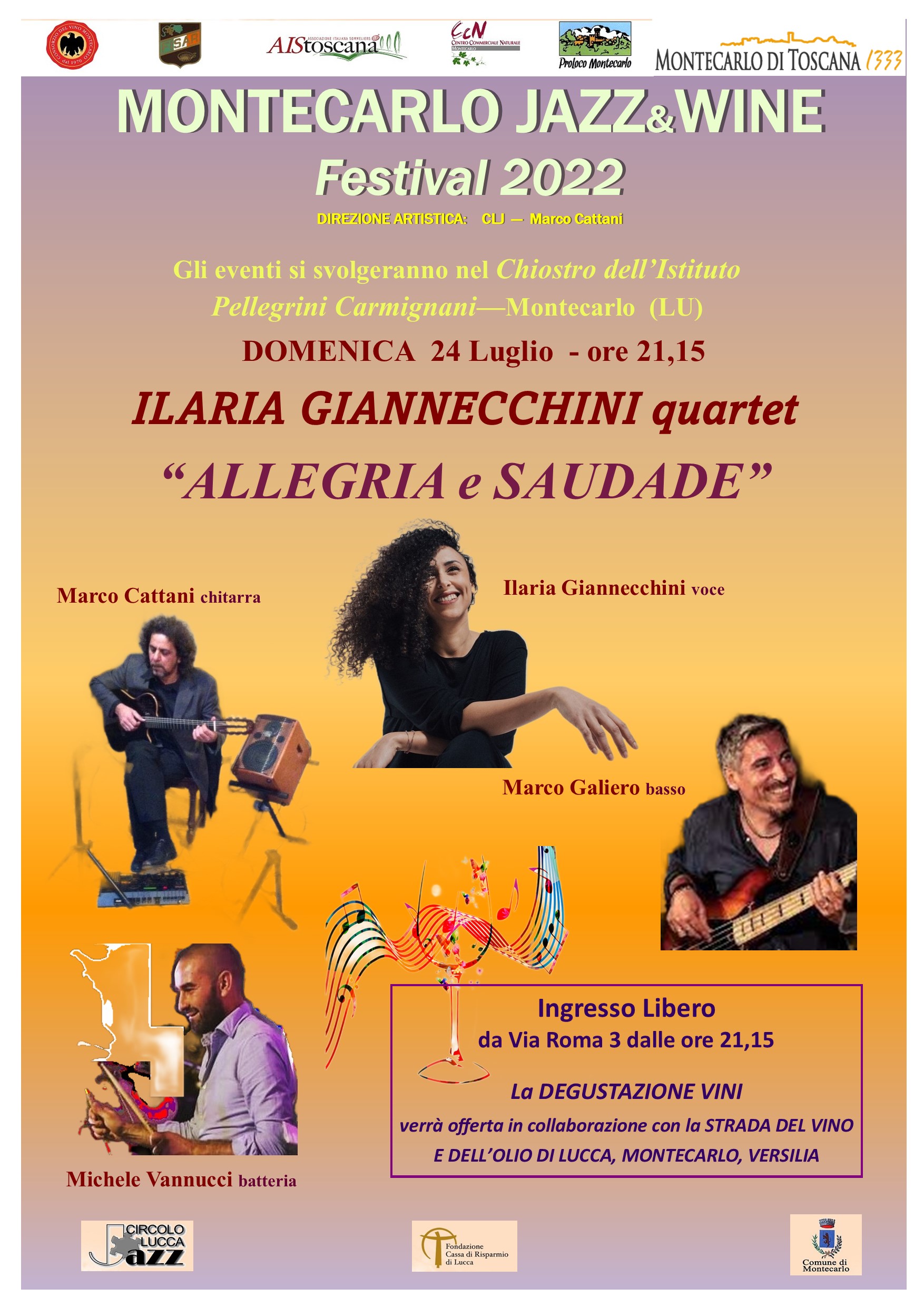 Domenica 24 luglio terza serata del Festival Montecarlo Jazz & Wine alla sua 18ma edizione. Sempre con grande affluenza di pubblico, anche stavolta si propone un validissimo quartetto con Ilaria Giannecchini alla voce accompagnata da Marco Cattani (che è anche direttore artistico del Festival) alla chitarra, Marco Galiero al basso e Michele Vannucci alla batteria. Offriranno un originale percorso jazzistico che ci porterà,con maestria, nel mondo del jazz internazionale.