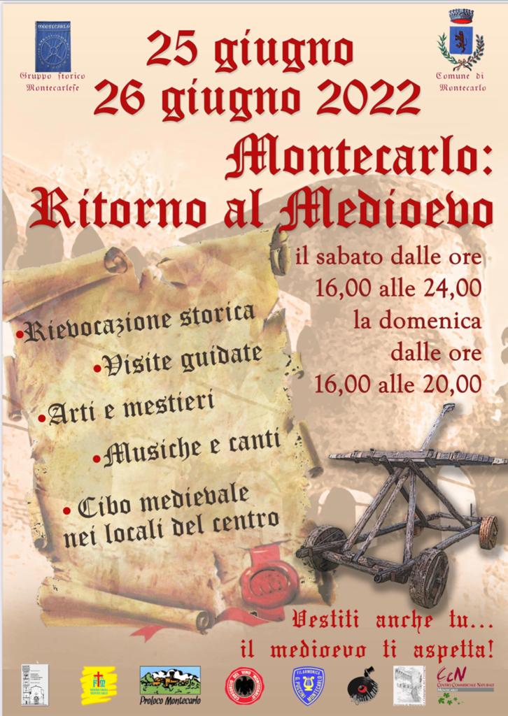 Montecarlo torna al Medioevo...proprio così! Grazie al Gruppo Storico Montecarlese, nel fine settimana di sabato 25 e domenica 26, il tipico paesino Medievale, con la sua Fortezza e le porte storiche, si trasformerà letteralmente: i figuranti proporranno arti e mestieri di quell'epoca, mostrando come si produceva la farina attraverso la macine a pietra e come si filava la lana; i soldati faranno la guardia al castello e mostreranno come si usano arco e frecce; non mancheranno i giochi medievali, con il lancio della noce e il gioco dei cerchietti. Il gruppo dei tamburini, poi, animerà le strade del paese richiamando a sé tutti gli spettatori grazie alle sfilate a ritmo di tamburi medievali, una alle ore 19 e una alle ore 21:30 di sabato e alle 19 di domenica. Il resto del paesino, con la collaborazione di ProLoco e Ccn, sarà coinvolto con abiti e addobbi medievali e gli esercizi proporranno cibi tipici del tempo.