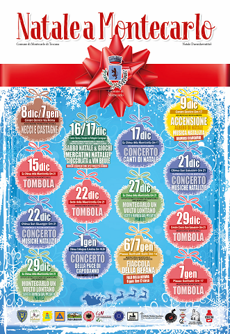 Grazie all’interessamento di tutte le associazioni del territorio (Centro Commerciale Naturale di Montecarlo, Consorzio dei Vini doc di Montecarlo, Aps Montecarlo, Musicalmente, Pro Montecarlo Aps, Gruppo Storico Montecarlese, Misericordia di Montecarlo, Filarmonica G.Puccini, Cines, Istituto Storico Lucchese, Coro della Collegiata) dal prossimo 8 dicembre fino al 7 gennaio, numerosi gli eventi che si alterneranno sul territorio comunale con coronamento nel borgo antico dove sabato 9 dicembre alle ore 17 l’accensione dell’albero natalizio ed il brindisi musicale nella centrale Piazza Carrara apriranno le danze.