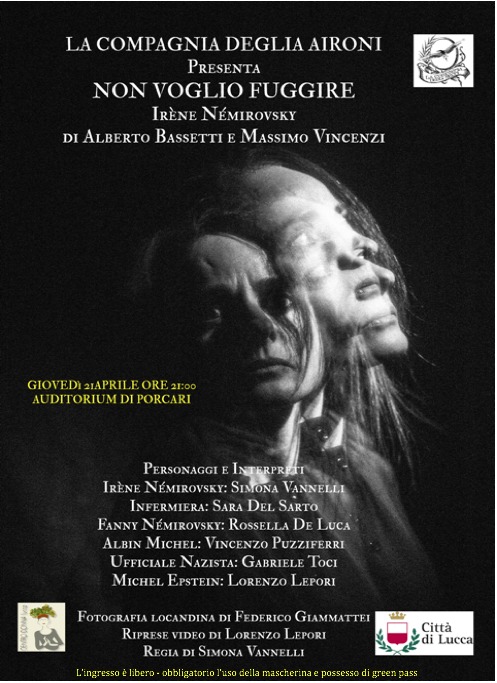Il Centro Donna Lucca, con la collaborazione del comune di Lucca, presenta lo spettacolo teatrale "Non voglio fuggire - Irène Némirovsky" a cura de La Compagnia degli Aironi che si terrà giovedì 21 aprile 2022 dalle 21 alle 22:45 presso l'Auditorium Vincenzo Da Massa Carrara, Via Roma, 121, 55016 Porcari, Lucca.