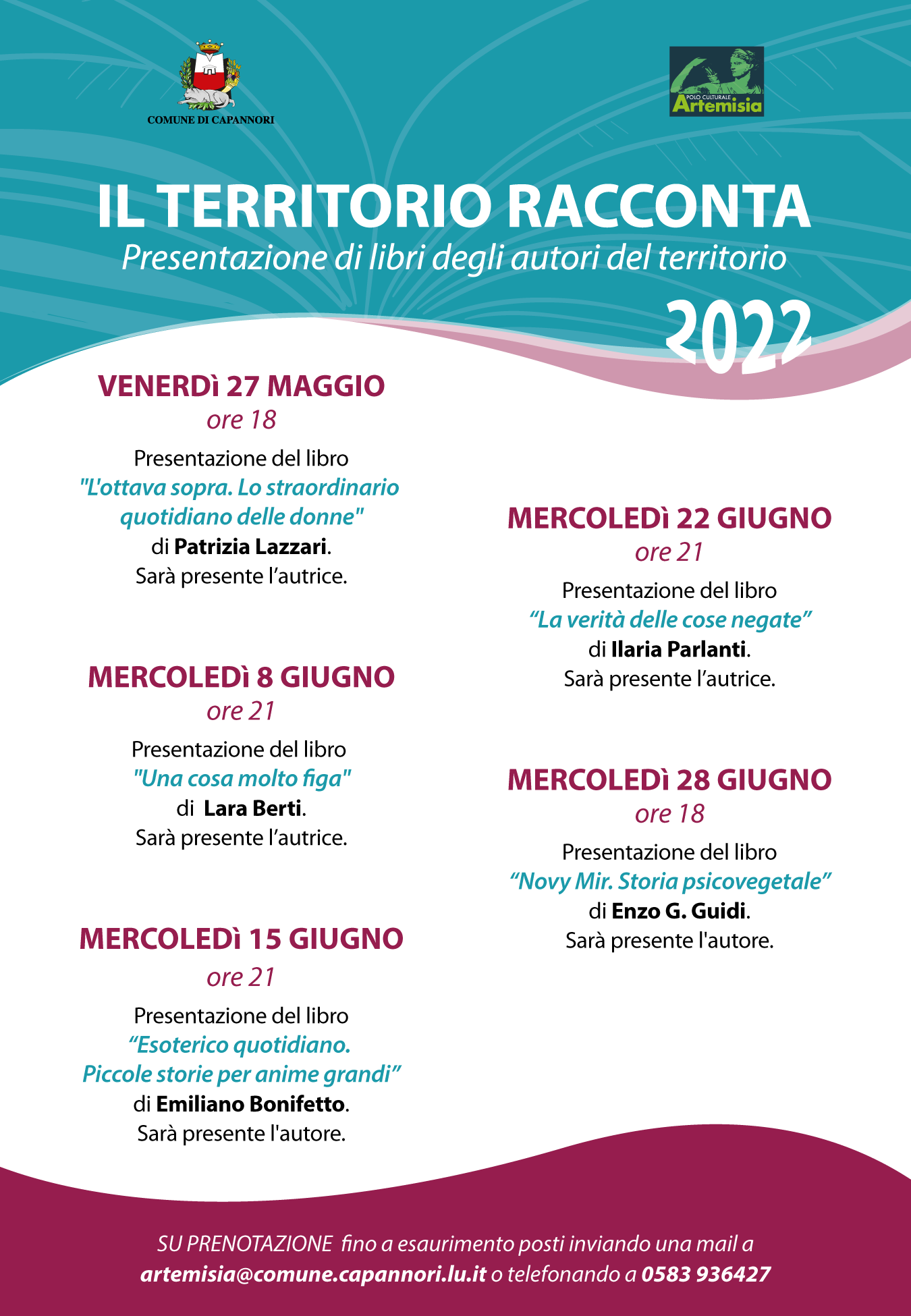 Al via a partire da venerdì 27 maggio un nuovo ciclo della rassegna 'Il territorio racconta' promossa dall'amministrazione comunale per valorizzare gli autori locali e farli conoscere ad un pubblico più ampio. Cinque gli appuntamenti in programma fino al 28 giugno al polo culturale Artèmisia di Tassignano.