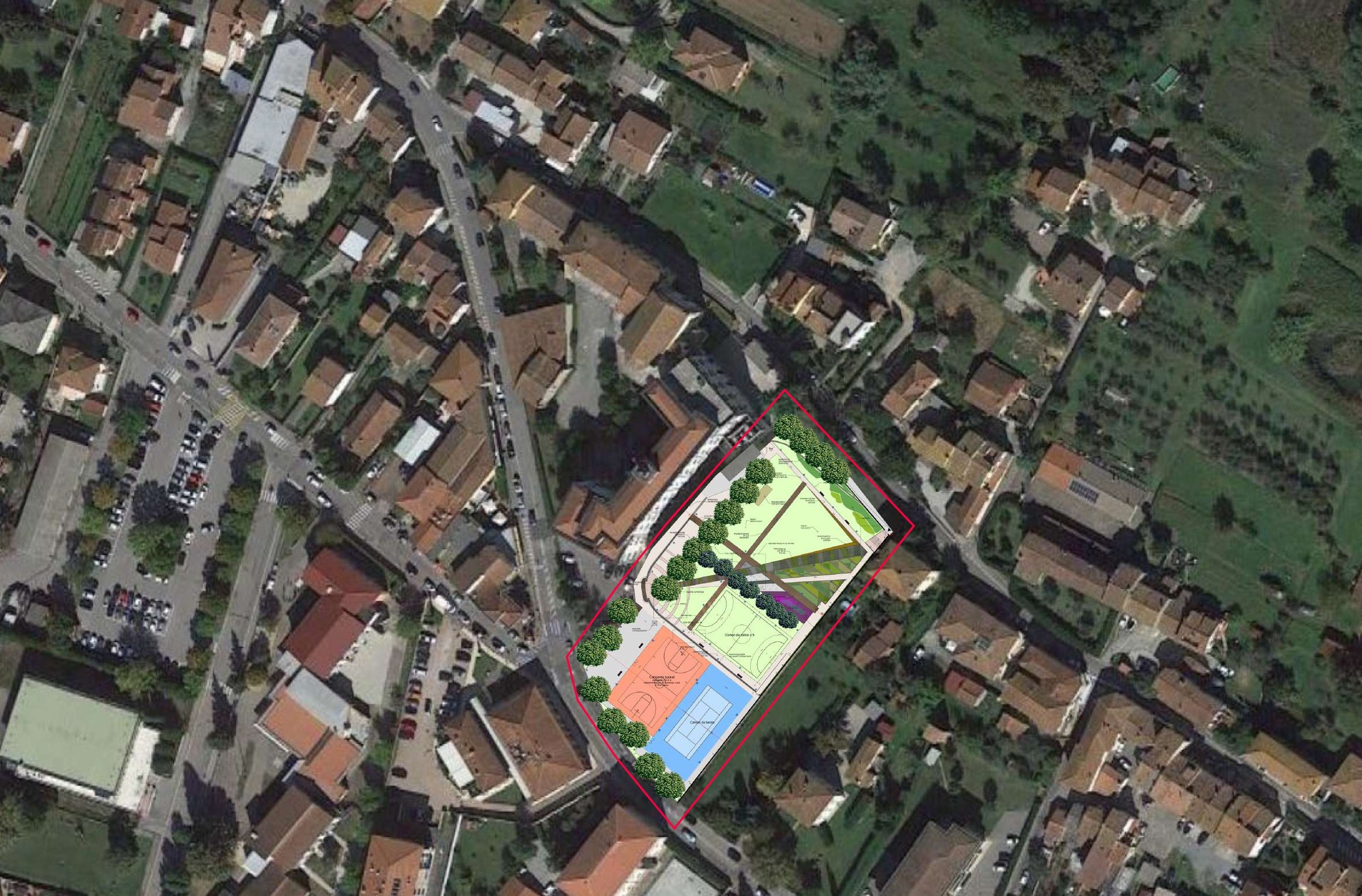 Il progetto definitivo, redatto dagli architetti Giannicola e Gianluca Bacci, prevede due tipi di trasformazioni. L'area a sud oggi occupata dai campi da tennis, pallavolo e pallacanestro vedrà il totale rifacimento della superficie bitumata e tinteggiata, con una superficie tecnica omologata dal Coni, e della rete di canalette per smaltire le acque piovane. Parallelo al campo da tennis, con orientamento nord sud, sarà realizzato un nuovo campo da pallacanestro di dimensioni regolamentari per partite e tornei di Serie A femminile e di Serie B maschile, a supporto della buona tradizione di basket espressa dal territorio. Il campo avrà funzione polivalente e potrà essere utilizzato anche per la pallavolo: i due sport potranno continuare quindi a essere praticati in un unico spazio, più grande, e non più in due campi piccoli a sé stanti.