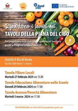 Grazie al contributo del progetto europeo FoodCLIC (https://foodclic.eu/) ripartono i lavori dei tavoli tematici della Piana del Cibo per progettare e realizzare azioni concrete sul territorio nell’ambito delle politiche legate all’alimentazione. La Piana del Cibo è una realtà che vede i Comuni di Capannori, Altopascio, Porcari e Villa Basilica uniti nella gestione associata delle politiche del cibo con la partecipazione attiva dei cittadini. I primi incontri dei tavoli aperti ad enti, associazioni, imprese, istituti di ricerca, operatori, cittadini si svolgeranno all’Ostello Il Rio di Vorno, in Via del Folle Mansi, 1 a Vorno.