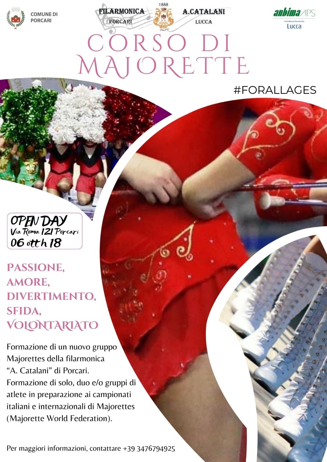 Un appuntamento molto importante è poi fissato per venerdì sei ottobre presso i locali dell’oratorio “Il Campanile” ex Cavanis in Via Roma 121, gentilmente messi a disposizione dalla Parrocchia, dove, con inizio alle ore 18.00 si terrà un “Open Day” durante il quale verranno presentati i corsi di musica e di majorettes, una novità assoluta quest’ultima per il territorio di Porcari, organizzati dalla Filarmonica “Alfredo Catalani”. Il corso sarà tenuto da un insegnante qualificato e permetterà di formare un gruppo majorettes della Filarmonica. La diffusione di gruppi di majorettes si accompagna alle bande italiane proseguendo una tradizione ormai consolidata e che prosegue tutt’ora.