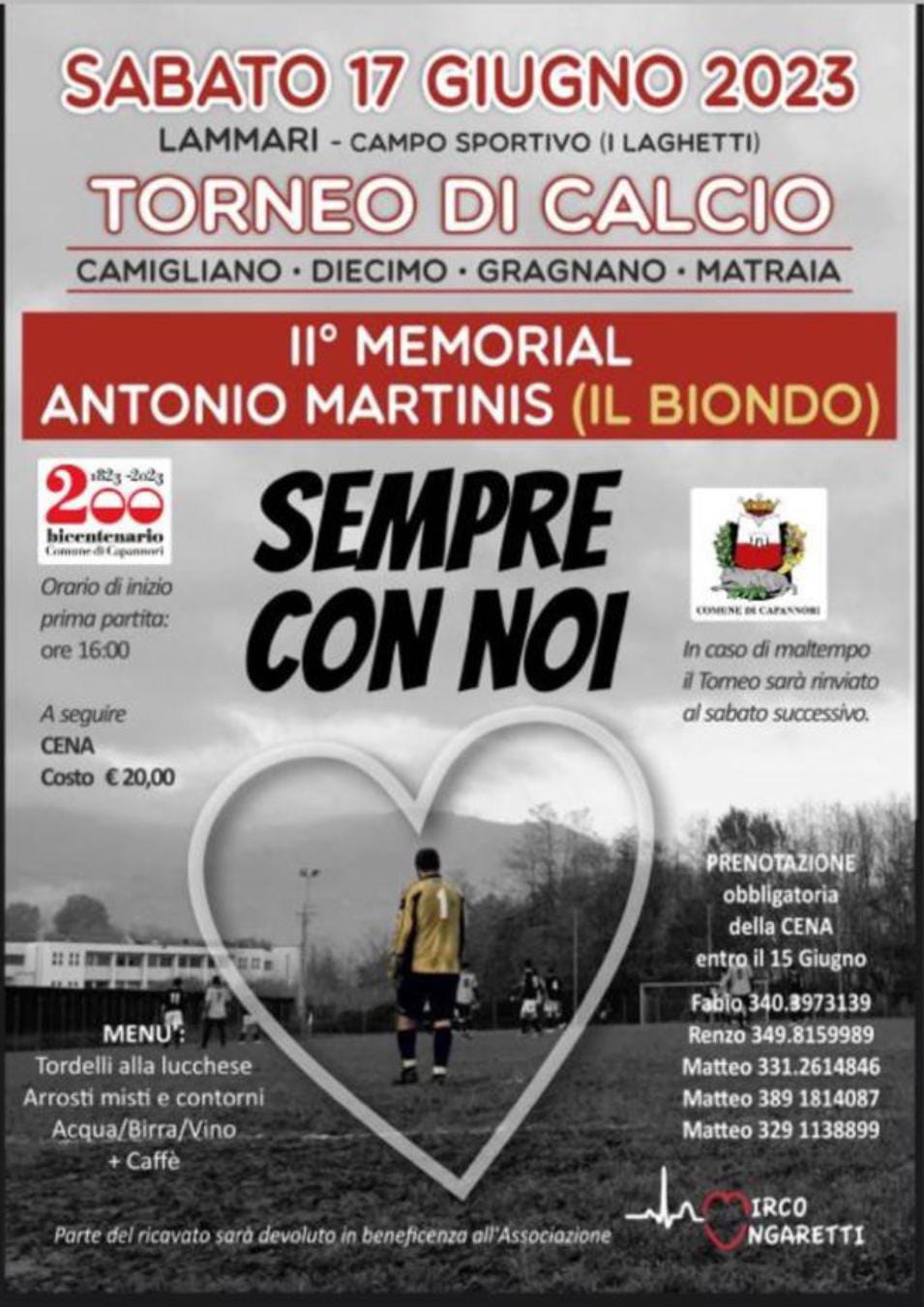Domani, sabato 17 giugno, a partire dalle ore 16, ai campi sportivi i Laghetti Isola Bassa di Lammari si terrà il secondo "Memorial Antonio Martinis - Il Biondo" in ricordo di Antonio Martinis, scomparso due anni fa, soprannominato Il Biondo, mitico numero 1 che ha militato in diverse squadre del territorio. L'iniziativa, promossa dagli amici di Antonio e dall'Associazione Mirco Ungaretti con il patrocinio del Comune, vedrà un quadrangolare calcistico al quale parteciperanno le squadre Atletico Gragnano, Camigliano, Diecimo e Matraia. .