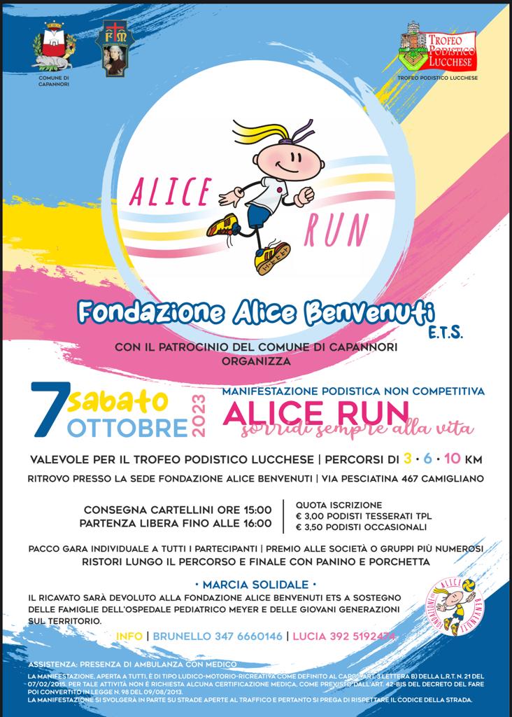 Con il patrocinio del Comune di Capannori, la Fondazione Alice Benvenuti E:T.S. promuove l'ALICE RUN come marcia solidale aperta a tutti, anche a chi desidera semplicemente mettersi in movimento scegliendo tra tre diversi percorsi, da 3, 6 e 10 chilometri.