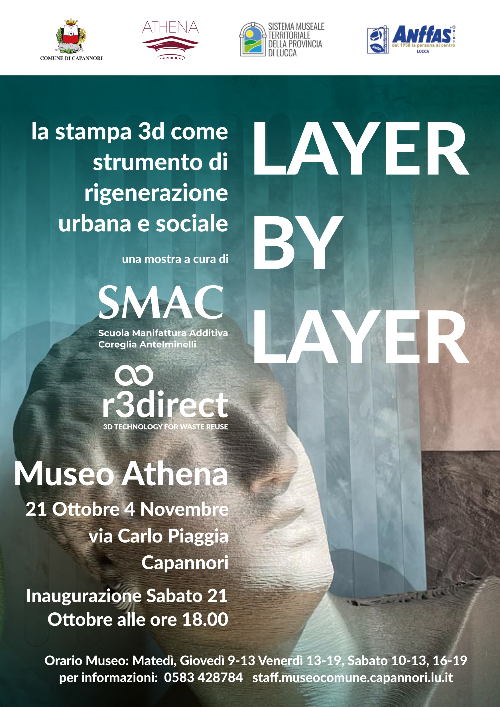 Sarà inaugurata sabato 21 ottobre alle ore 18.00 al Museo Athena di Via Carlo Piaggia a Capannori la mostra "Layer by Layer". Un' esposizione unica dedicata alla stampa 3D di grande formato con materiali riciclati, dove sarà possibile vedere come il rifiuto urbano possa essere risorsa importante per la produzione di arredi e di opere d'arte. La mostra è organizzata da R3direct, azienda leader nella stampa 3D di grande formato e SMAC, Scuola di Manifattura Additiva di Coreglia Antelminelli.