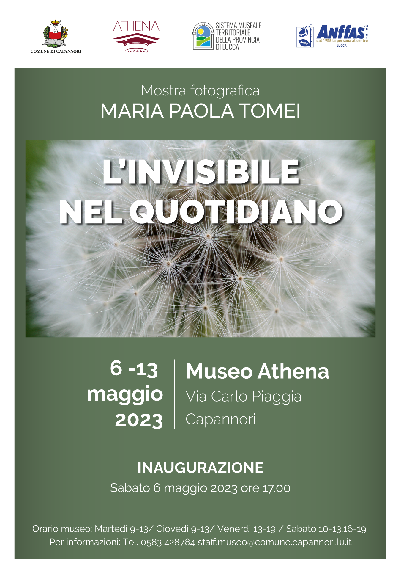 Sabato 6 maggio, alle ore 17, al Museo Athena di via Carlo Piaggia a Capannori si terrà l’inaugurazione della mostra fotografica “L’invisibile nel quotidiano” di Maria Paola Tomei.