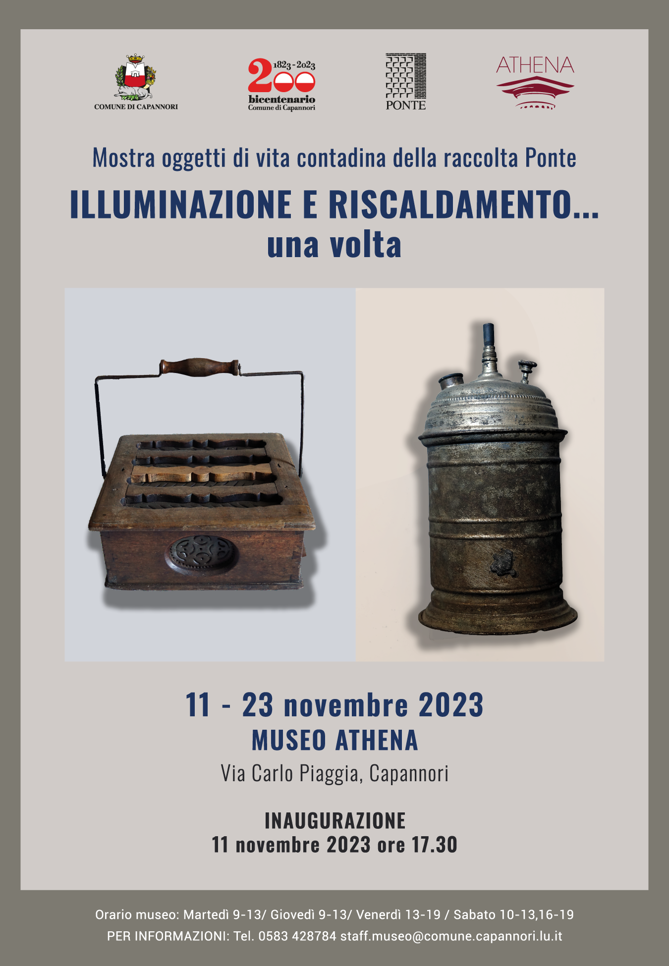 Sabato 11 novembre, alle ore 17.30, al Museo Athena di via Carlo Piaggia, a Capannori, sarà inaugurata la mostra 'Illuminazione e riscaldamento ...una volta' organizzata dall'associazione Culturale Ponte in collaborazione con il Comune. Con questa esposizione, che mostra oggetti di vita contadina della raccolta Ponte, l'associazione inizia a trattare tematiche legate al mondo contadino che non riguardano strumenti di lavoro, bensì oggetti di vita quotidiana. In questo caso quelli legati all'illuminazione e al riscaldamento utilizzati nel passato. Un tempo dal freddo ci si riparava male e così dal buio e dalle tenebre e sono state studiate alcune soluzioni, anche minimali ma efficaci, per poter ovviare e poter sopportare i disagi relativi. Alcune di queste potranno essere ammirate al Museo Athena a partire da sabato prossimo e fino al 23 novembre.