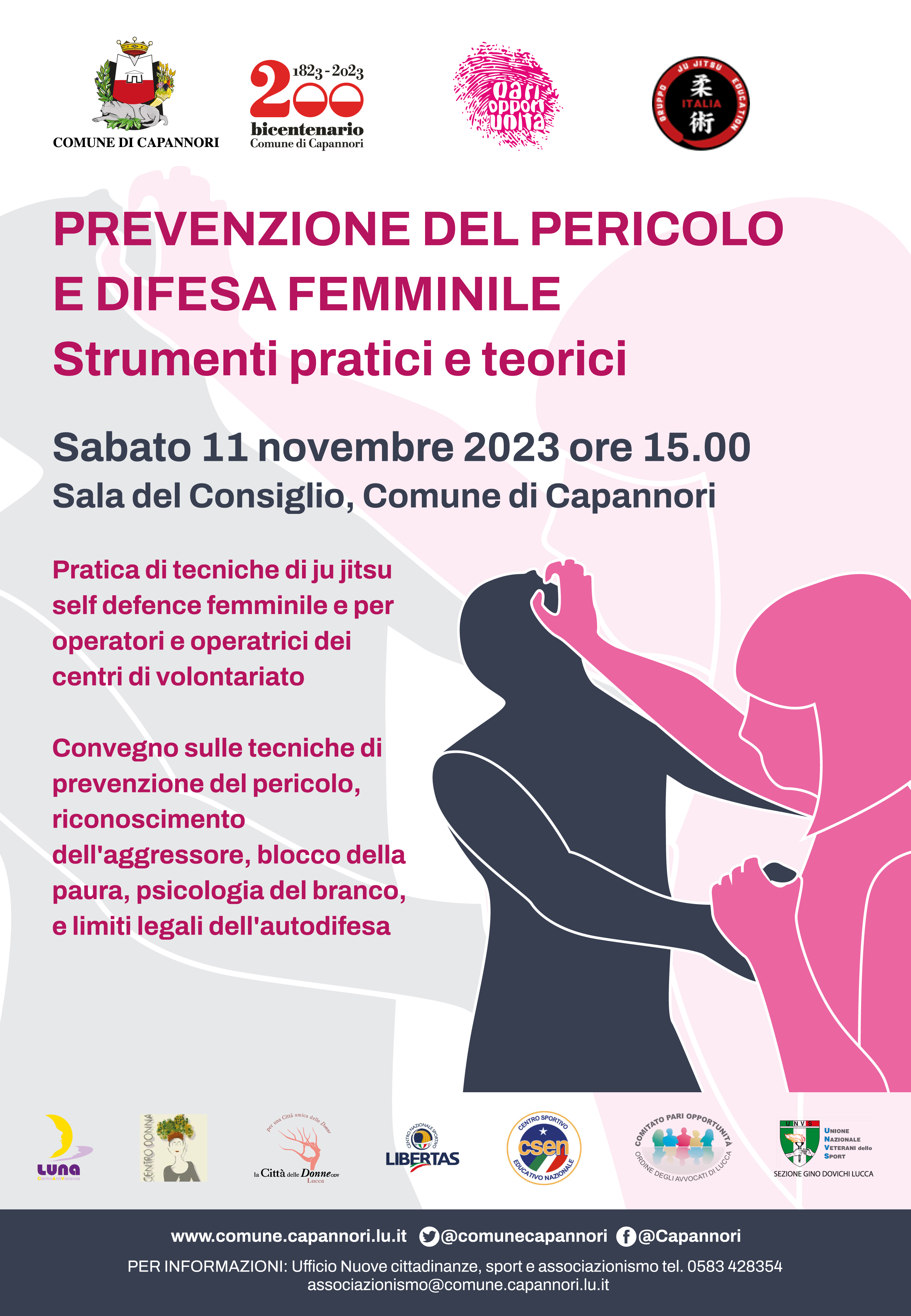 Una iniziativa dedicata alla prevenzione del pericolo e alla difesa femminile e degli operatori di pubblica assistenza è in programma sabato 11 novembre nella sala consiliare di Capannori a partire dalle ore 15.00. L'incontro, promosso dalla Commissione Pari Opportunità e dall'Ufficio Sport del Comune di Capannori, in collaborazione con il Gruppo Ju Jitzu Education Italia vedrà una prima parte pratica ed una seconda parte teorica. Dalle 15 alle 16.00 si terrà una lezione pratica di Ju Jitsu self defence femminile e per gli operatori e le operatrici dei centri di volontariato a cura dei Maestri Luca Angeli e Mattia Buldo.