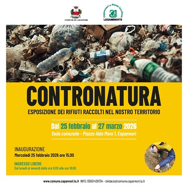 Si intitola ‘Contronatura’ l’esposizione di rifiuti raccolti dai volontari di Legambiente Capannori e Piana Lucchese ed altre associazioni del territorio che sarà inaugurata mercoledì 25 febbraio, alle ore 15, nell’atrio della sede comunale.