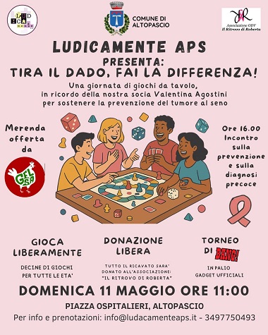 Unire il divertimento alla solidarietà e alla consapevolezza. Domenica 11 maggio, a partire dalle 11, piazza Ospitalieri ad Altopascio ospiterà "Tira il dado, fai la differenza!", una giornata dedicata al gioco da tavolo, organizzata da LUDICAmente APS, in ricordo di Valentina Agostini, socia dell'associazione e appassionata giocatrice, scomparsa prematuramente a causa di un tumore al seno.