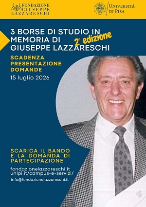 Il bando completo, con il fac-simile della domanda, è reperibile da oggi sul sito della Fondazione Giuseppe Lazzareschi, www.fondazionelazzareschi.it e sul sito dell'Università di Pisa al link https://www.unipi.it/campus-e-servizi/opportunita-e-tempo-libero/premi-e-borse-di-studio/