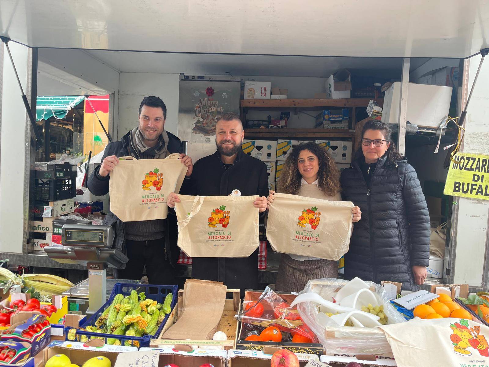Spille identificative e borse shopper in tela, con su scritto "tradizione qualità e convenienza", per gli operatori, e per i clienti, del nuovo mercato settimanale di Altopascio: la distribuzione, avvenuta ieri mattina (giovedì 18 dicembre), segna un nuovo passo nel percorso di riqualificazione del mercato del giovedì e nella nuova organizzazione dell'area mercatale nel centro cittadino voluta dall'amministrazione D'Ambrosio.