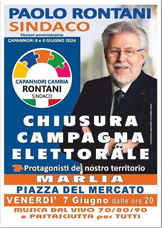 È in programma per venerdì 7 giugno alle 20 in Piazza del Mercato a Marlia, la chiusura della campagna elettorale di Paolo Rontani, candidato sindaco per il centrodestra alle prossime elezioni amministrative di Capannori. La serata sarà animata da musica dal vivo, con hit degli anni '70, '80 e '90, e si caratterizzerà per una cena a base di pastasciutta per tutti i presenti. Sarà un'occasione per incontrare Paolo Rontani e gli altri candidati in un contesto informale e vivere insieme l'emozione degli ultimi momenti della campagna elettorale. Paolo Rontani e i candidati delle liste invitano tutti i cittadini di Capannori a partecipare a questo momento di festa e condivisione.