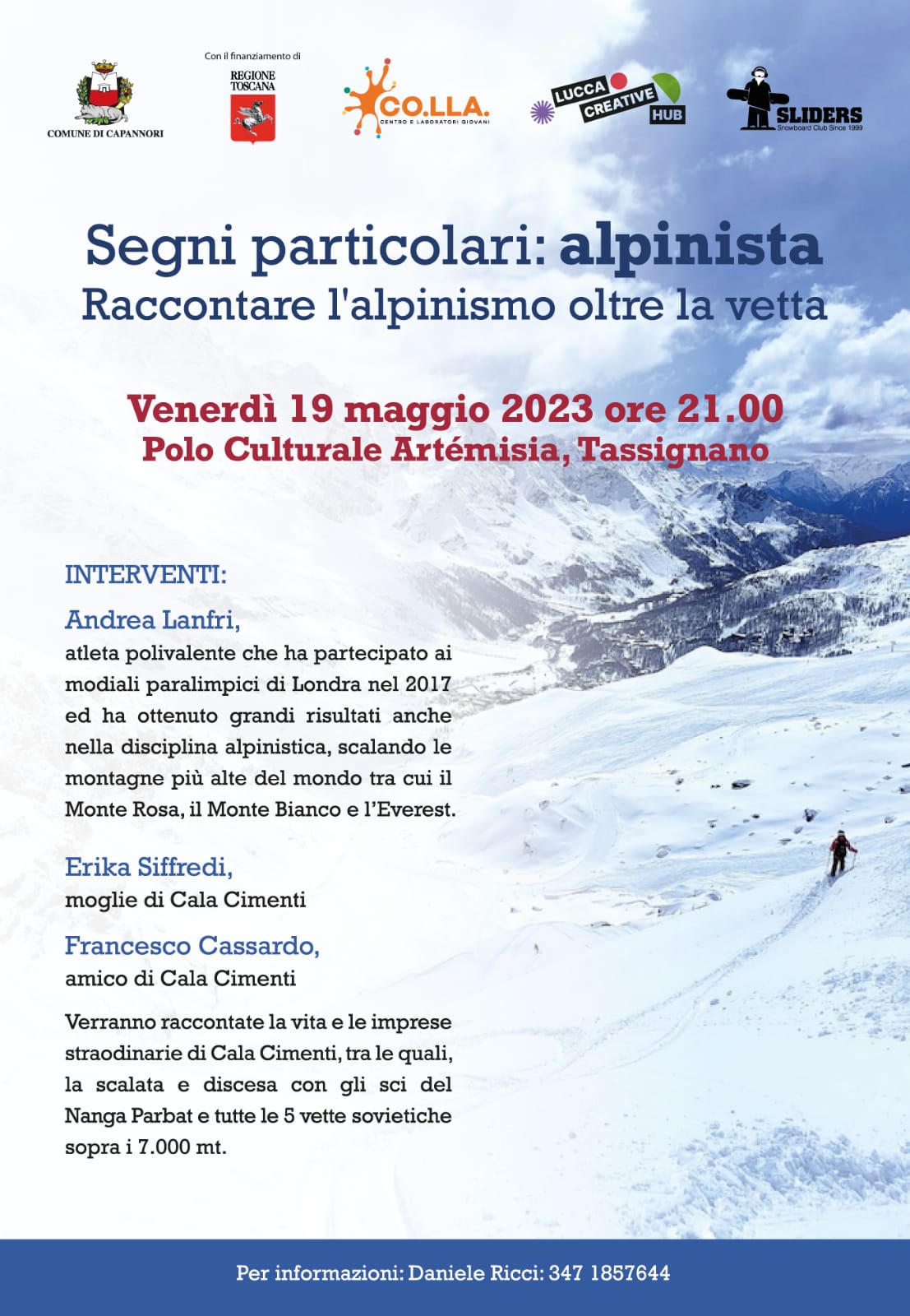 Venerdì 19 maggio, alle ore 21.00, al Polo Culturale Artèmisia di Tassignano, si terrà l'incontro "Segni particolari: alpinista – Raccontare l'alpinismo oltre la vetta", una delle tante attività realizzate nell'ambito del progetto CO.LLA – Centro e laboratori giovani, promosso dal Comune di Capannori e finanziato dalla Regione Toscana.