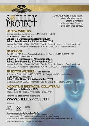 Continuano con lo Shelley Project gli eventi di Halloween Celebration 2024 - TRENTENNALE. Il progetto si presenta come confronto letterario tra scrittori: ogni scrittore dovrà scrivere un breve racconto fantastico inedito (horror/thriller/fantasy/gothic e fantascienza), creando la propria opera nei luoghi legati a Mary Shelley, quindi Bagni di Lucca, Lucca, Viareggio e l'intera Lucchesia.
