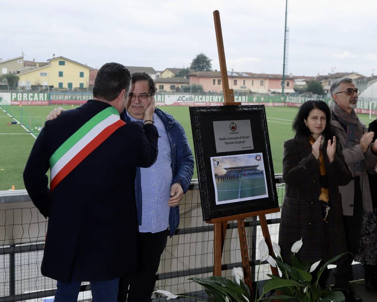 "Daniele ha sempre amato il calcio e ha sempre voluto giocare a Porcari – ha detto il primo cittadino – in quello stadio proprio dietro casa sua. Ha iniziato a tirare calci al pallone a 7 anni e non ha mai smesso, affermandosi sempre più come punto di riferimento per i compagni di squadra. Con affetto e semplicità abbiamo deciso di dare il nome di Daniele Giusfredi a questo impianto sportivo oggi riqualificato e fiore all'occhiello della Toscana. La forza della memoria, d'altronde, si esprime anche attraverso piccoli gesti simbolici che fanno bene alla comunità. Ho sempre detto e ripetuto che questo è lo stadio dei giovani ed è bello che oggi porti anche il nome di un giovane".