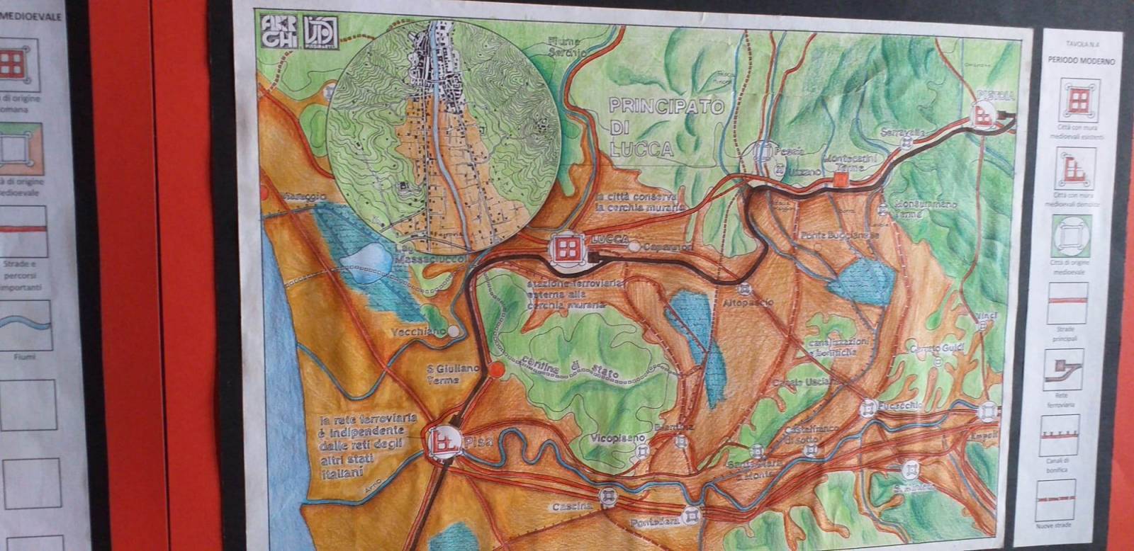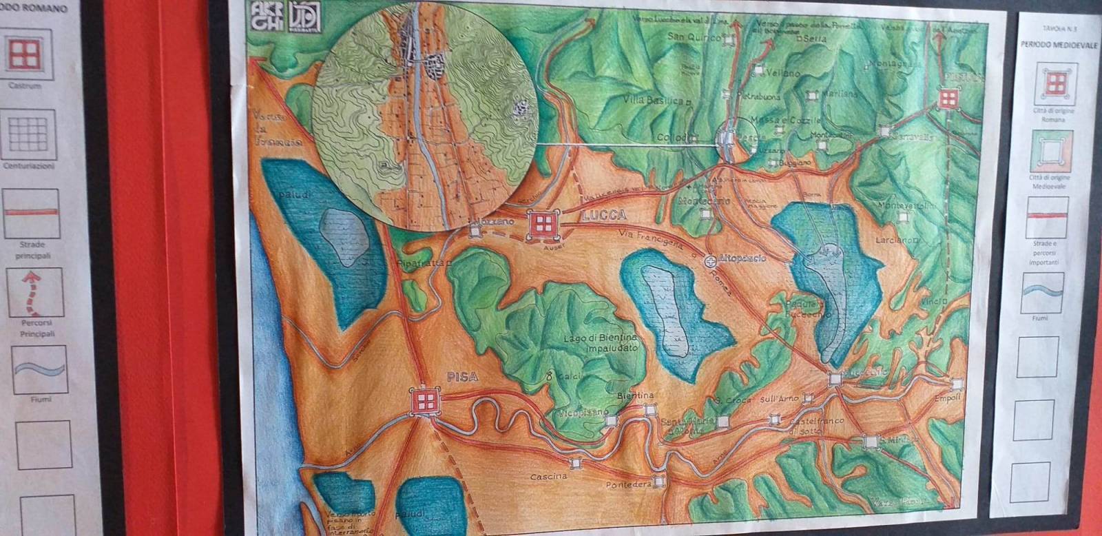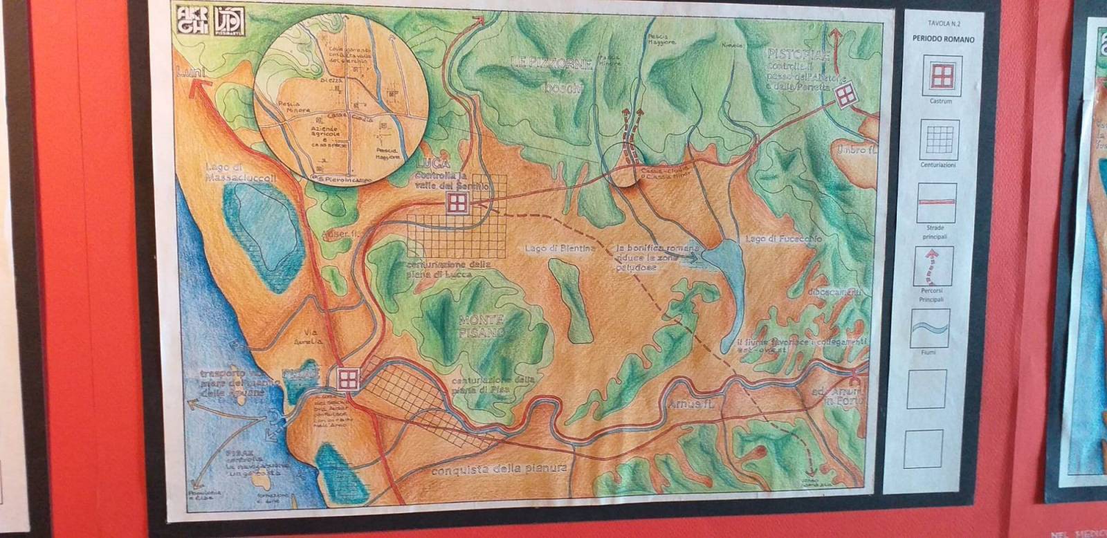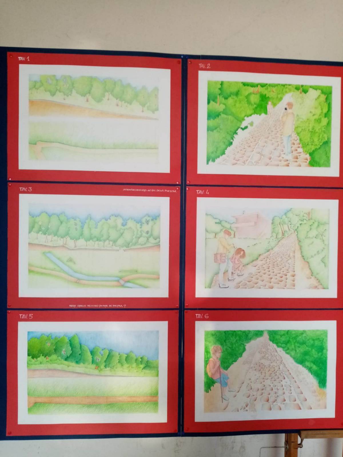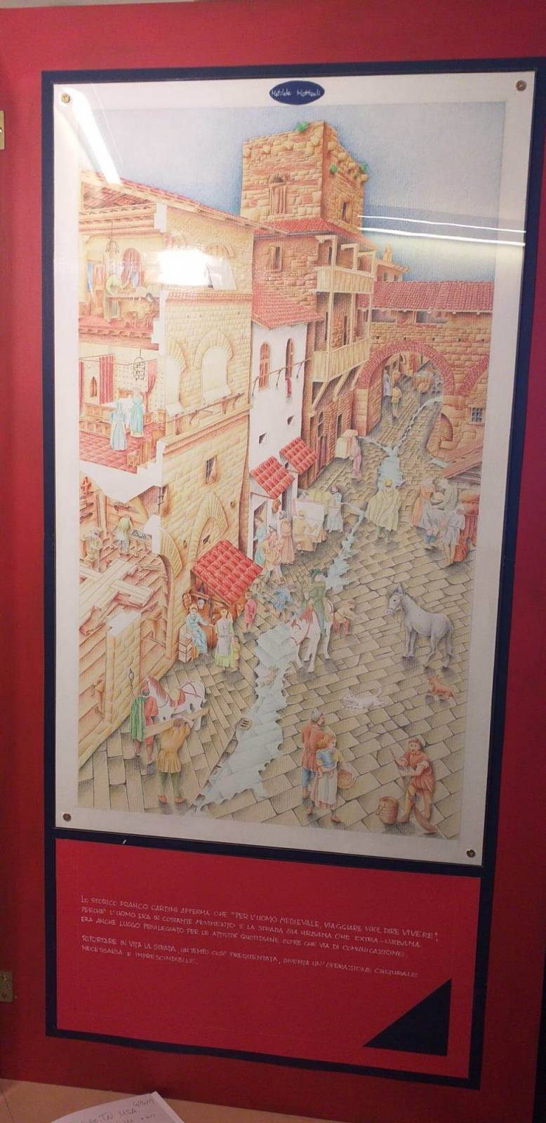 Perchè strada regia e non via? Lo hanno spiegato Lucrezia e Matilde dell'associazione Vissidarte. Il termine strada deriva dal latino "via strata" ed indica la via principale costituita da vari strati sovrapposti. L'antica Strada Regia Postale è stata utilizzata fino alla metà del 1700 che collegava Pistoia a Lucca. I pannelli successivi sono composti da quattro disegni e ciascuno di esso rappresenta il percorso in epoche divere: etrusco, romano, medievale fino ai giorni nostri. Analizzano l'evoluzione morfologica e antropologica della via stessa e i contenuti sono tratti dal testo di Giulio Mezzetti "Geografia 2, evoluzione e sviluppo delle relazioni spaziali".